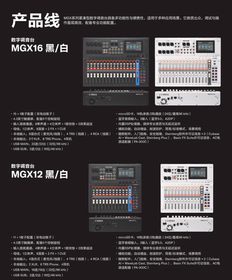 | 板载处理器 | DSP | 门限、压缩器、EQ、Sweet Spot Morphing Channel Strip(压缩&EQ)、 Guitar Amp Classics (功放模拟器)、PitchFix(音色变换器)、闪避器、多段压缩器、压缩扩展器、延迟、REV-X(混响) | 门限、压缩器、EQ、Sweet Spot Morphing Channel Strip(压缩&EQ)、 Guitar Amp Classics (功放模拟器)、PitchFix(音色变换器)、闪避器、多段压缩器、压缩扩展器、延迟、REV-X(混响) | 门限、压缩器、EQ、Sweet Spot Morphing Channel Strip(压缩&EQ)、 Guitar Amp Classics (功放模拟器)、PitchFix(音色变换器)、闪避器、多段压缩器、压缩扩展器、延迟、REV-X(混响) | 门限、压缩器、EQ、Sweet Spot Morphing Channel Strip(压缩&EQ)、 Guitar Amp Classics (功放模拟器)、PitchFix(音色变换器)、闪避器、多段压缩器、压缩扩展器、延迟、REV-X(混响) |