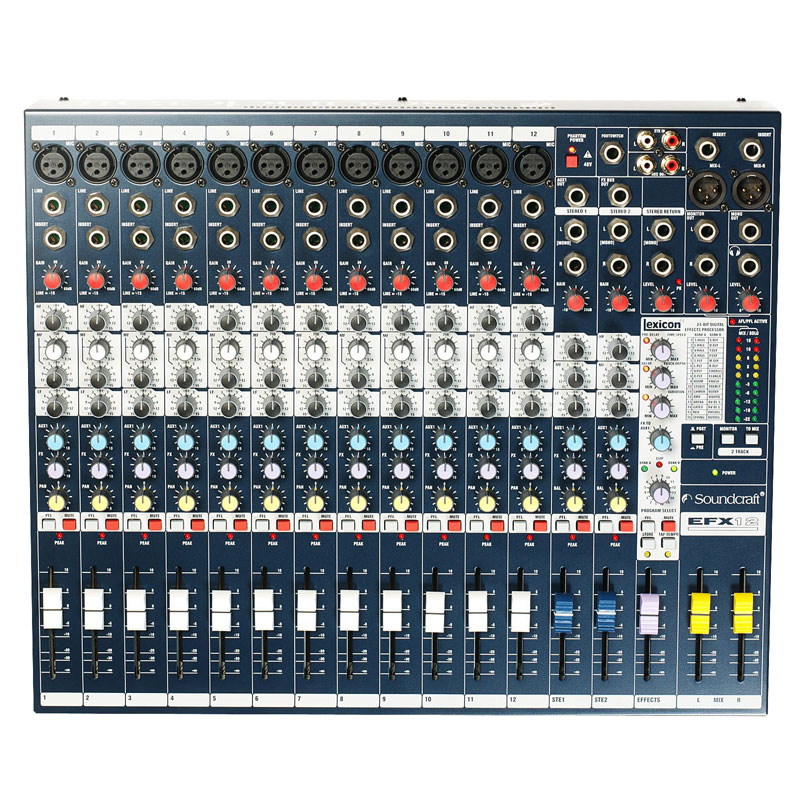 EFX 系列多用途调音台具有 Soundcraft 优良的音质、优良的特性和用心服务的性价比,EFX 系列内置广播级美国莱思康效果器。应用范围包括小型场地、会议室、现场录音、实况演出、固定安装系统和广播电台等。