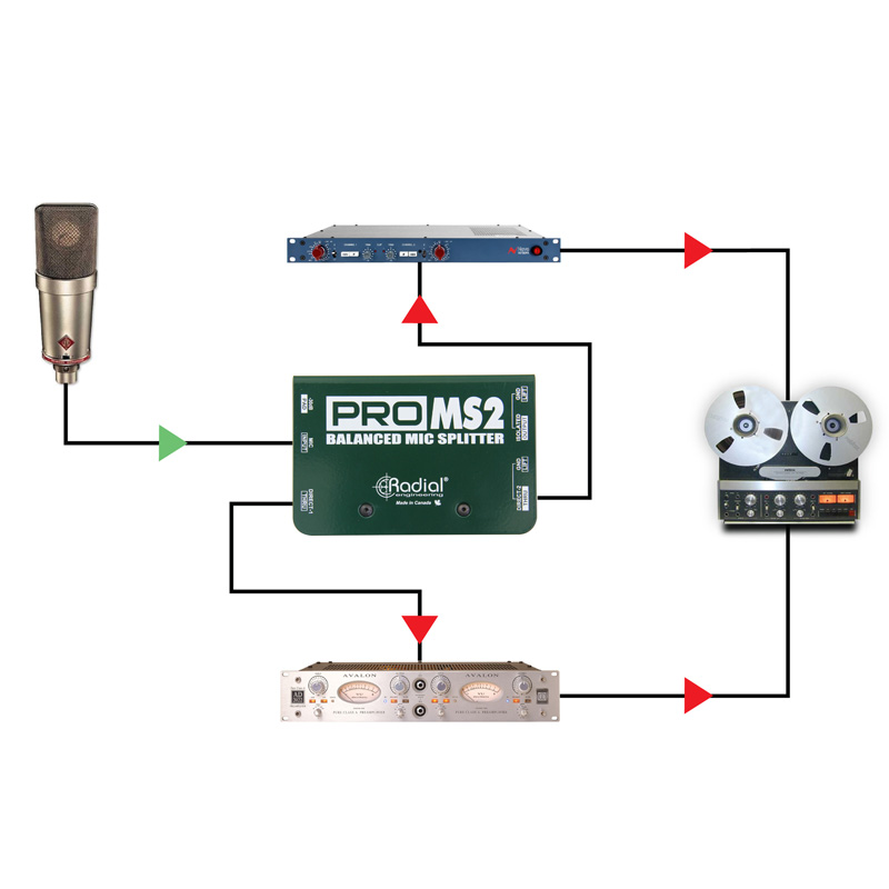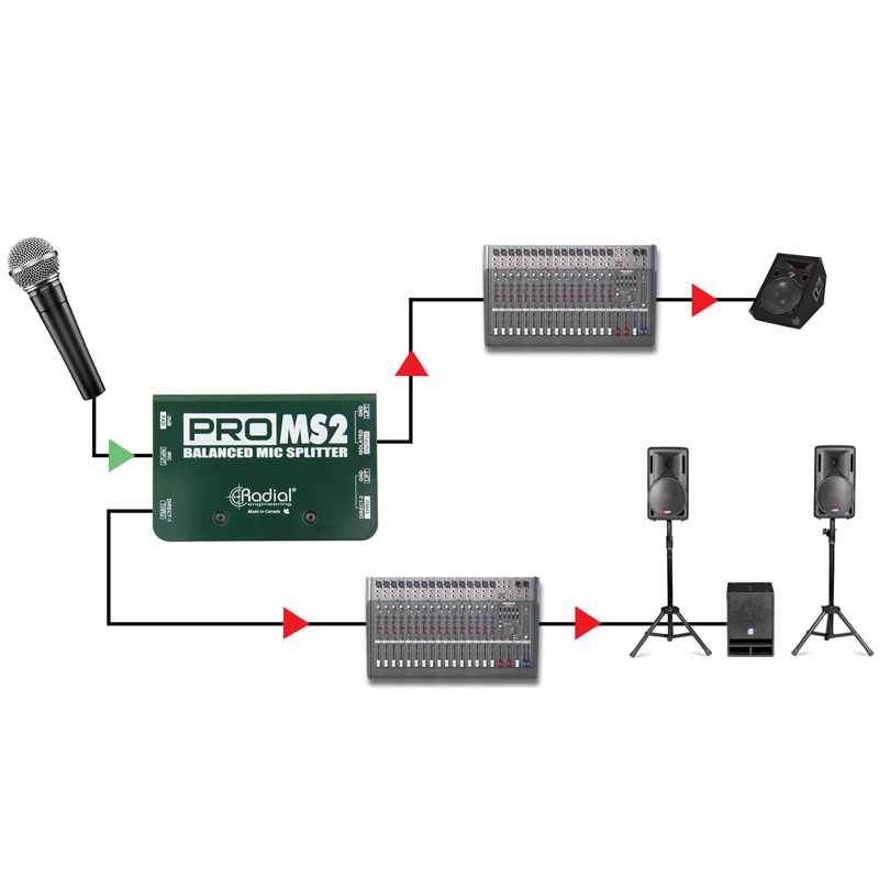 Radial ProMS2 是拆分麦克风以同时馈送多个混音器的优良接口。90% 隔离取消了两个调音台之间潜在的接地回路,以实现安静的性能,同时主输出提供到麦克风的 48V 幻象电源返回路径。