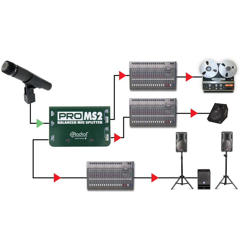 有时,您需要同时为主混音器、舞台监听器和录音机供电。将源话筒连接到 ProMS2 XLR 输入,将带有幻象电源返回路径的直接输出连接到主混音器,将带有接地提升的直接输出连接到监听台,将隔离输出连接到录音系统。