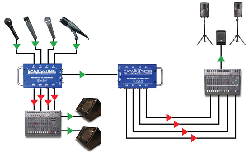 Catapult TX4M 和 RX4M 是四通道麦克风电平分配器和隔离器,可让您将四个麦克风馈送分开并通过一根标准的 5 类屏蔽双绞线电缆传输它们。这允许您将麦克风拆分到三个不同的位置;例如前台、监视器和录音设备。两个单元中的麦克风电平隔离变压器使每个目的地与其他目的地保持隔离,取消了由接地回路引起的问题,例如嗡嗡声和嗡嗡声。TX4M 有四个 XLR-F 输入和四个隔离的 XLR-M 输出,而 RX4M 有四个直接 XLR-M 输出和四个隔离的 XLR-M 输出。两个装置都具有带有接地升降开关的 RJ45 型 Ethercon 连接。只要使用屏蔽的 Cat 5 电缆,就可以通过直接输出为麦克风提供幻象电源。