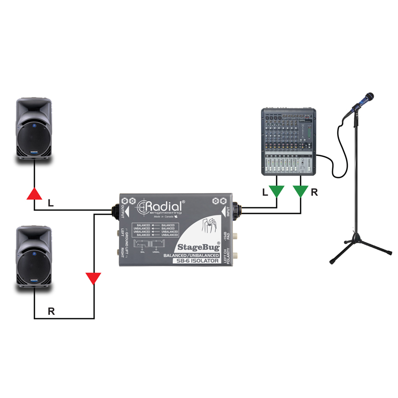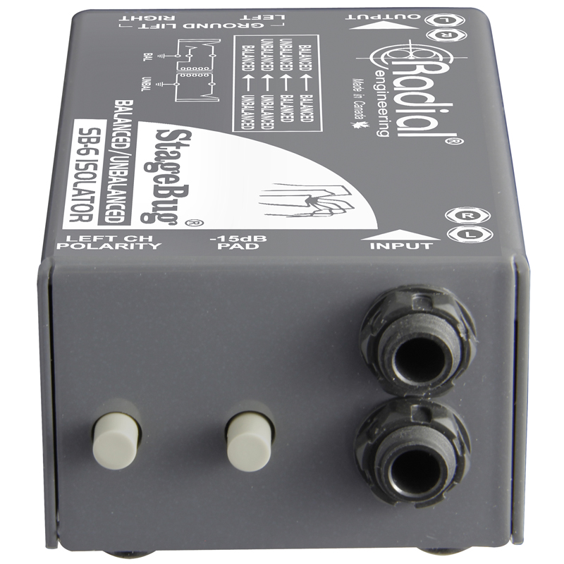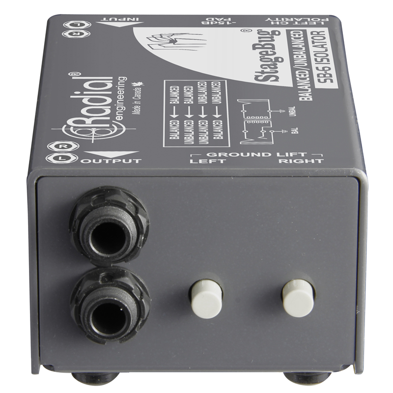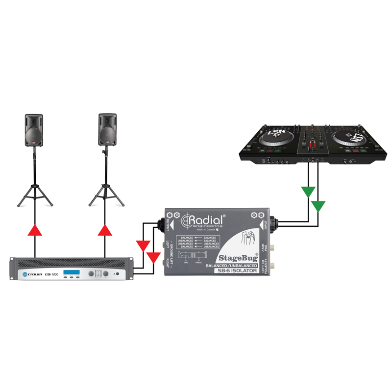 使用 SB-6 将 DJ 混音器的输出隔离到功率放大器,以取消接地回路引起的嗡嗡声和嗡嗡声。可以使用 ?" 单声道或 TRS 连接器。