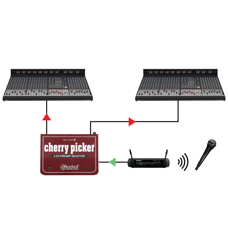 “直线”平衡信号路径不仅可用于麦克风!您可以将 Cherry Picker 用作所有类型线路电平设备的 1x4 切换台。