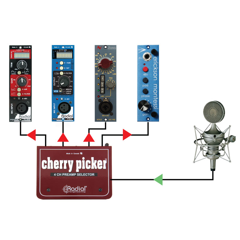 Cherry Picker 是一款值得信赖的切换器,可让您在共享单个麦克风的同时比较多达四个前置放大器。