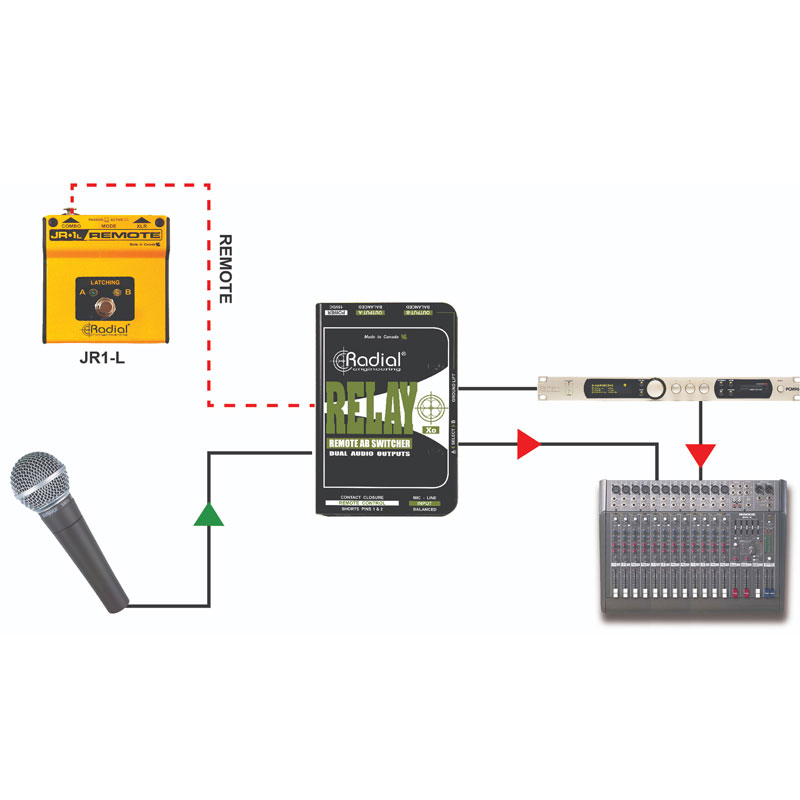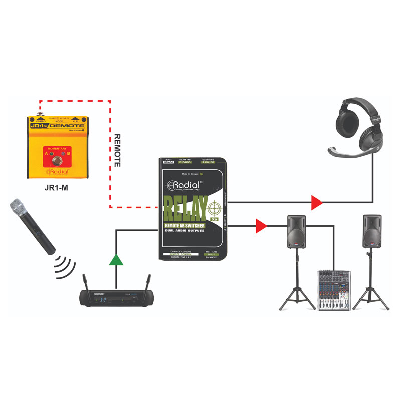 当艺术家在巡演中使用无线麦克风时,接收器通常位于舞台外。Relay Xo 上的远程输入允许它连接到无线接收器旁边以减少电缆杂乱,同时仍然通过远程脚踏开关为舞台上的艺术家提供控制。两个版本的 Radial JR1 脚踏开关可用于 Relay Xo;JR1-M 带有一个瞬时开关,只要踩下脚踏开关,就会开启输出 B,而 JR1-L 带有一个锁定开关,可以保持之后选择的输出。