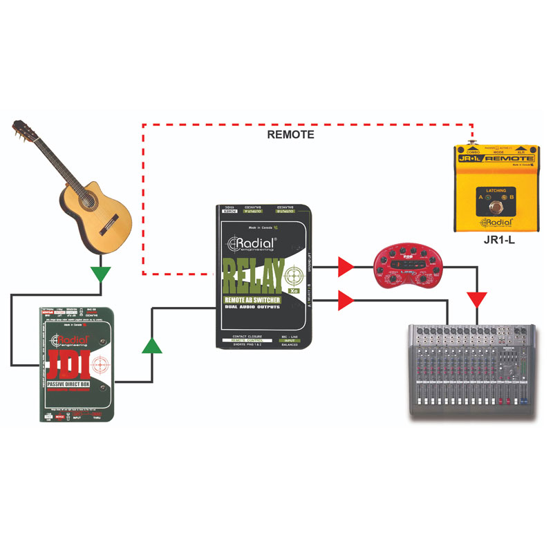 曾经希望您可以为您的原声吉他为独奏或特定歌曲添加特别效果吗?使用继电器在混音器上的普通和独奏通道之间切换。使用 Radial JR1-L 远程控制并在两者之间切换,就像 Eric Clapton 独奏一样!