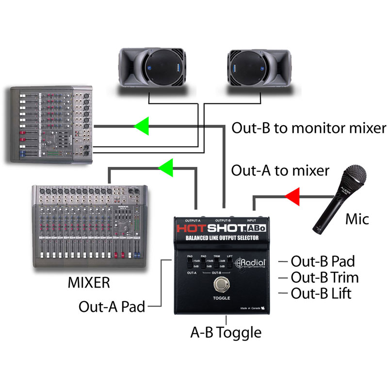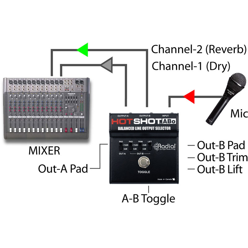 想象一下,当您在舞台上唱歌时能够控制额外的回声或混响!只需将您的麦克风连接到 ABo 输入,然后将输出发送到调音台上的两个独立通道。设置一干一湿。您现在是一名音频工程师!