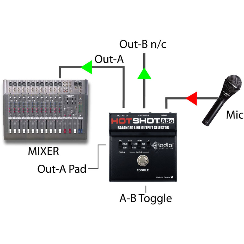 Hotshot ABo 采用平衡 XLR 输入,并提供使用舞台上的无源脚踏开关在两个目的地之间切换信号的能力。这使其成为各种应用的理想选择,包括在混音控制台上驱动两个通道以进行干湿效果路由,将动态麦克风从 PA 系统转移到监听器或对讲系统,或者在咳嗽时暂时静音信号。ABo 使用锁定脚踏开关,因此它会停留在之后选择的输出上,直到您再次踩下脚踏开关。