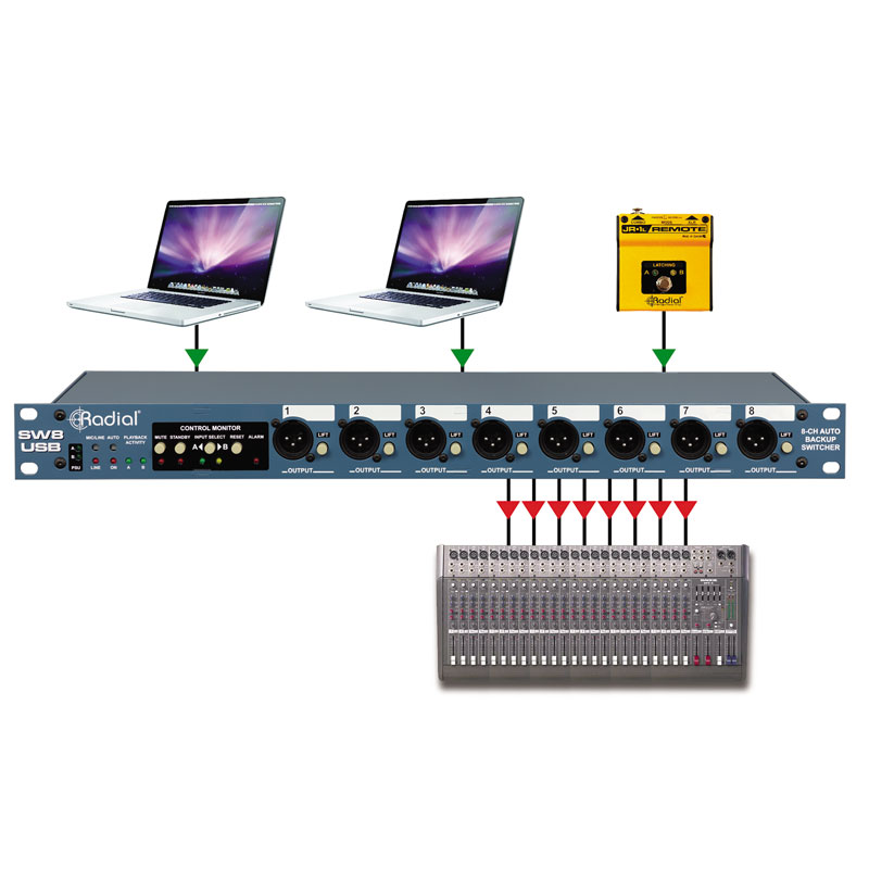 Radial SW8-USB是一种简化的解决方案,可在舞台上采用冗余播放,回放系统,具有双USB输入,可让您直接连接到主计算机和备份计算机,在现场表演期提供8个质量好音频通道,让您在现场演出时放心。