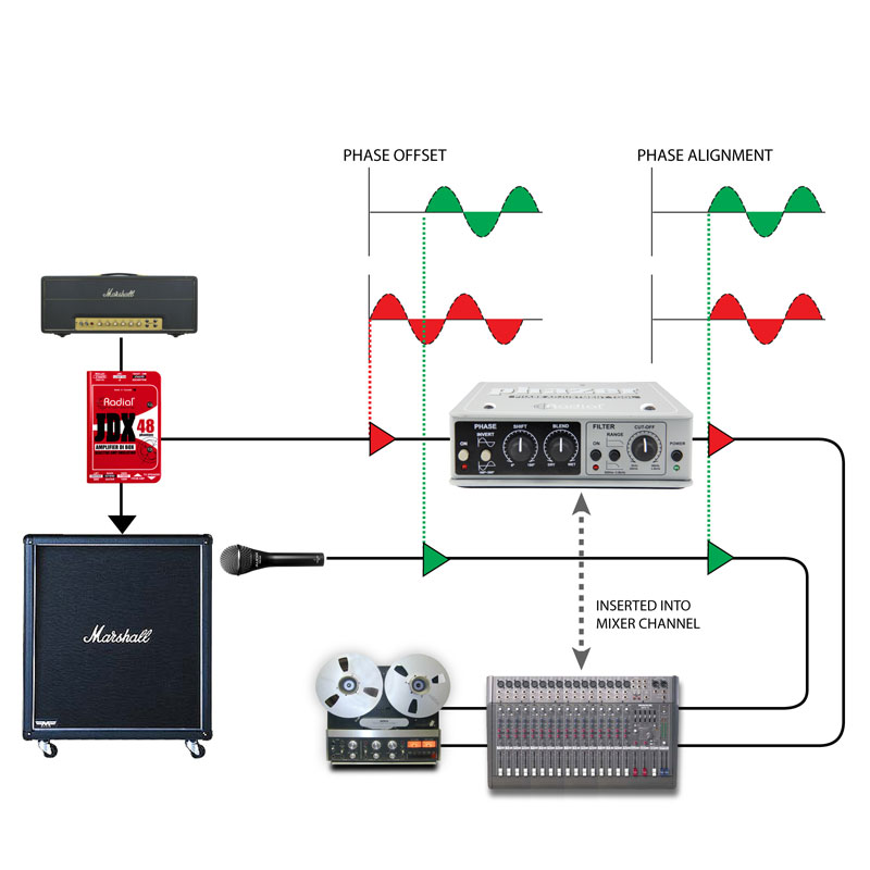 有时,获得优良的吉他音色似乎需要很长时间。这是由于舞台共振、室内声学和麦克风位置的轻微偏移等不规则性造成的。将 Radial JDX 直接盒与扬声器上的常用 SM57 结合使用。相位调整 JDX,在几秒钟内,您将获得巨大的吉他声音。
