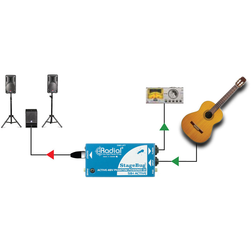 StageBug 等-1 即插即用,易于使用。Connect,它会自动将您的 Hi-z 乐器信号转换为 lo-Z 并对其进行长期平衡。