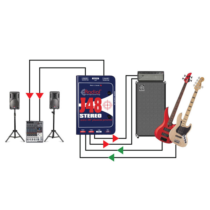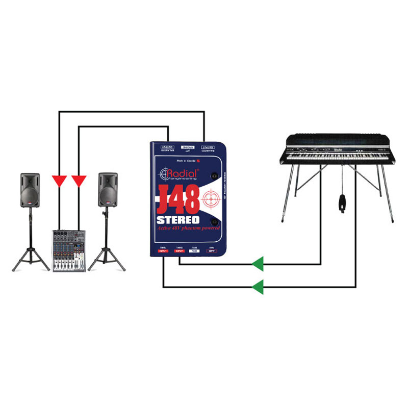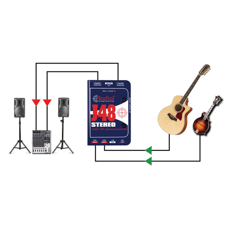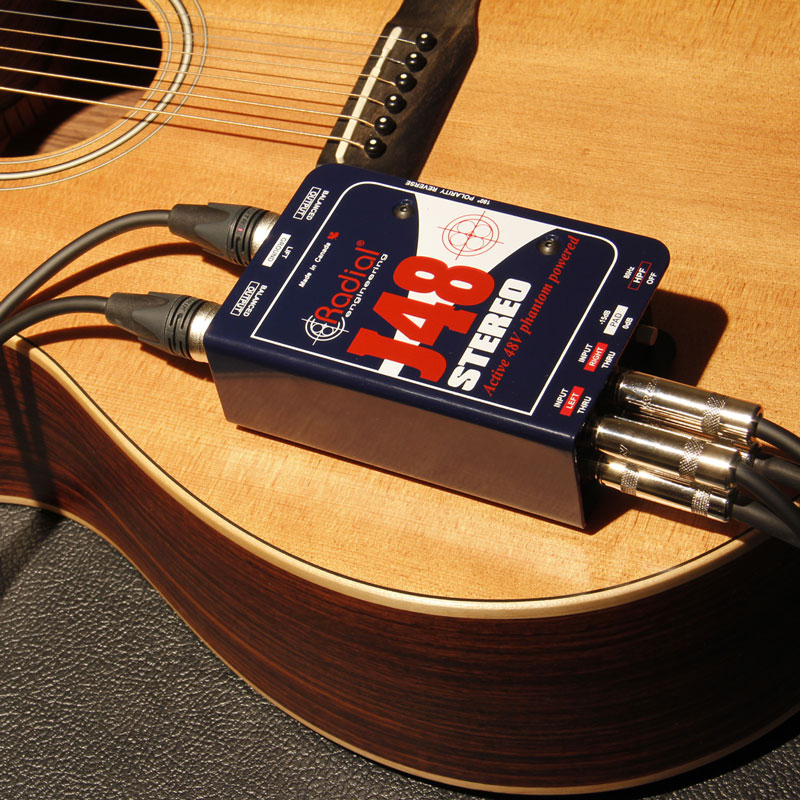 附加的裕量可显着减少所有类型的失真, 使乐器的自然音调和特征散发出光芒。J48 Stereo 保持左右声道之间的立体声隔离,使其可以在两个单独的乐器上使用,也可以与立体声源(例如键盘)一起使用。