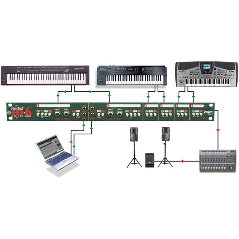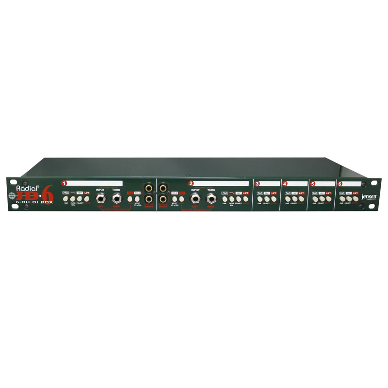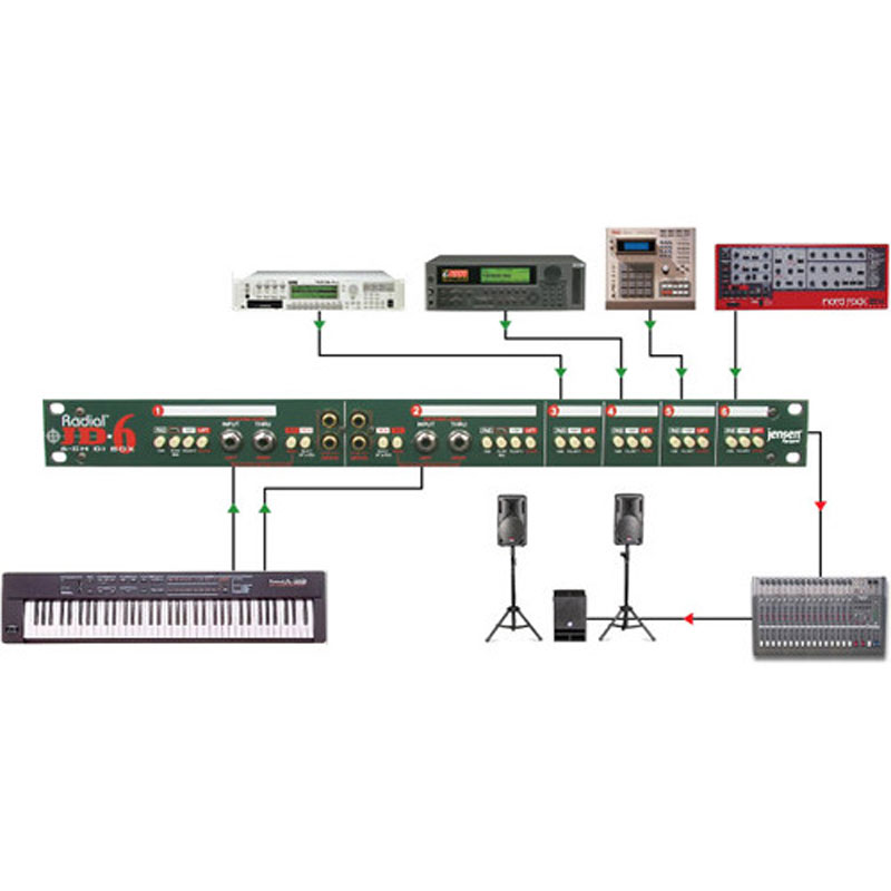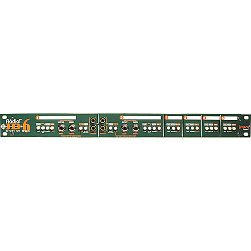 JD6 源自行业标准 Radial JDI?,结合了六个带有额外 RF 滤波的优良 Jensen 变压器,以确认以小的噪声、相移或失真实现佳信号传输。它们还能够承受极端的信号电平,这使得 JD6 在管理高输出有源设备(例如数码钢琴)时特别效果优良,这些设备通常会使大多数直接箱或前置放大器过载。每个 JD6 通道都配备了一个后置的 ?" 乐器输入和用于艺术家放大器的直通输出以及一个平衡的 XLR 输出以馈送混音台,而通道 1 和 2 包括前面板连接器,可立即切换输入插入电缆以提高演播室的效率。