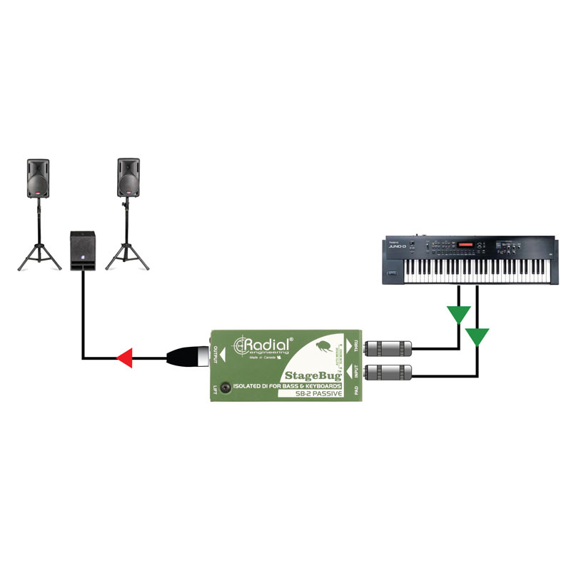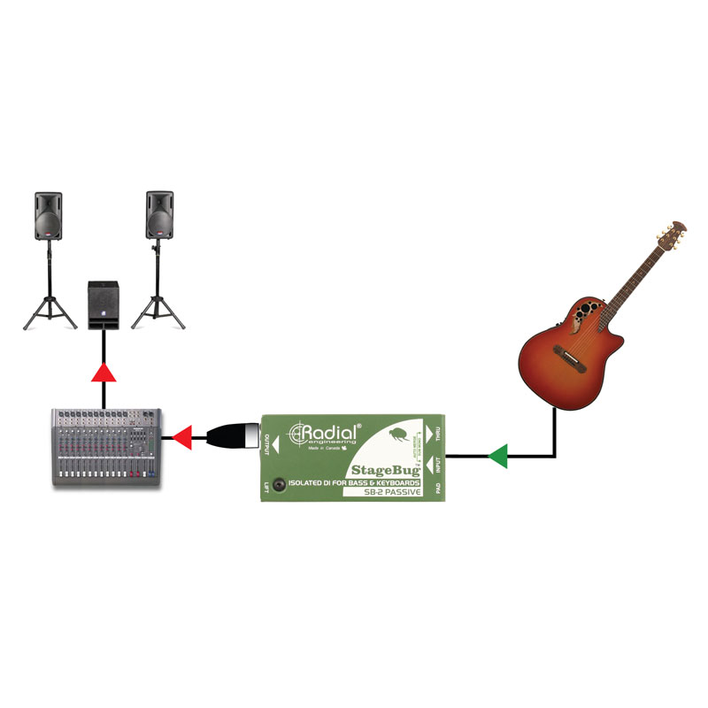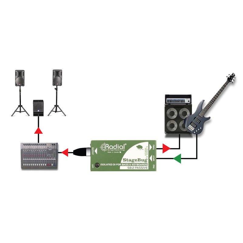 将您的贝司连接到 StageBug SB-2;将直通信号发送到您的放大器,并将输出发送到 PA 系统。变压器隔离取消了由接地回路引起的令人讨厌的嗡嗡声和嗡嗡声。