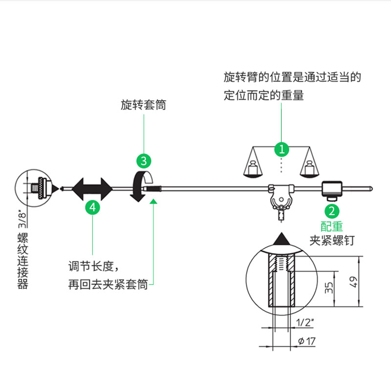 带1/2英寸螺纹的伸缩臂。可调整配重。用于20811型和21411型。