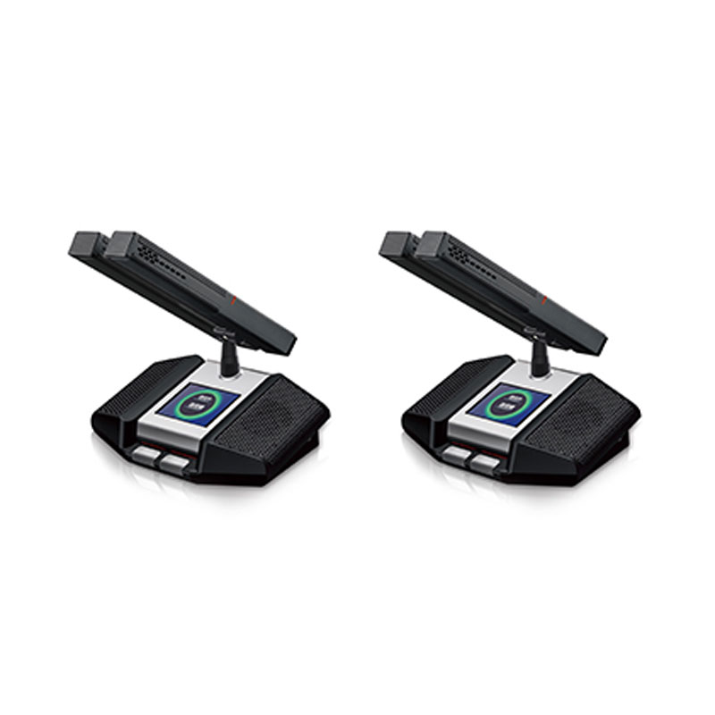 (2)阵列式会议单元全金属台面式设计,稳重且质感,无遮挡人员视线设计,桌面更整洁;配备2英寸高清夜晶屏,具有高亮度、高对比度、宽可视角度、低功耗等,可显示会议单元的发言列表、发言计时、信号、电量、信号强度等信息;电感触摸开关无机械按键声,寿命长并具防水功能,双色指示灯;会议单元具有充电口,可支持直供电或电池充电;标配2节1.5V电 池,电池容量达1200mAh,可持续10小时发言或连续12小时工作或可直供电不限工作时间;内置双天线,大大提升信号传输效率,兼容升级程序;配置有啸叫抑制功能电路,内置15单元超心型电容咪芯,可达2米拾音距离,高保真原声;支持中英文语言界面切换。