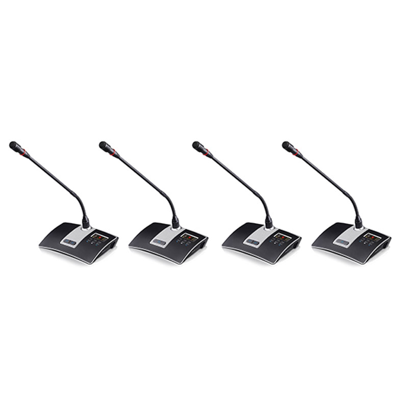 (2)阵列式会议单元全金属台面式设计,稳重且具有质感,无遮挡人员视线设计,桌面更整洁;配备2英寸高清夜晶屏,具有高亮度、高对比度、宽可视角度、低功耗等,可显示会议单元的发言列表、发言计时、信号、电量、信号强度等信息;电感触摸开关无机械按键声,寿命长并具性能稳定功能,双色指示灯;会议单元具有充电口,可支持直供电或电池充电;标配2节1.5V电 池,电池容量达1200mAh,可持续10小时发言或连续12小时工作或可直供电不限工作时间;内置双天线,优良提升信号传输效率,兼容升级程序;配置有啸叫阻止功能电路,内置15单元超心型电容咪芯,大的可达2米拾音距离,高保真原声;支持中英文语言界面切换。