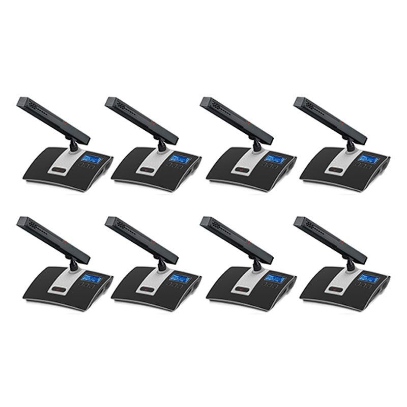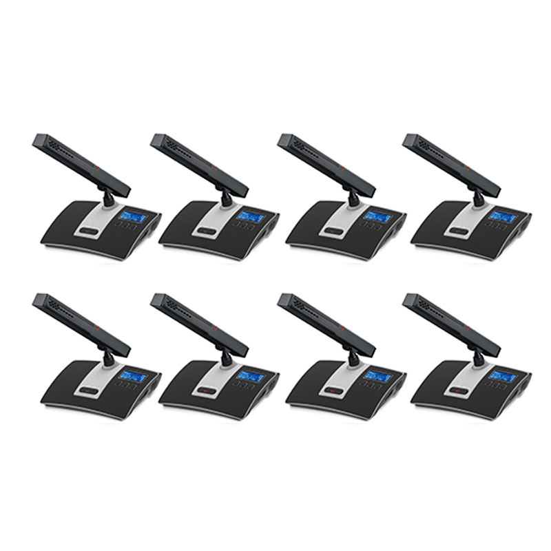 (2)阵列式会议单元全金属台面式设计,稳重且质感,无遮挡人员视线设计,桌面更整洁;配备2英寸高清夜晶屏,具有高亮度、高对比度、宽可视角度、低功耗等,可显示会议单元的发言列表、发言计时、信号、电量、信号强度等信息;电感触摸开关无机械按键声,寿命长并具性能稳定功能,双色指示灯;会议单元具有充电口,可支持直供电或电池充电;标配2节1.5V电 池,电池容量达1200mAh,可持续10小时发言或连续12小时工作或可直供电不限工作时间;内置双天线,优良提升信号传输效率,兼容升级程序;配置有啸叫阻止功能电路,内置15单元超心型电容咪芯,可达2米拾音距离,高保真原声;支持中英文语言界面切换。