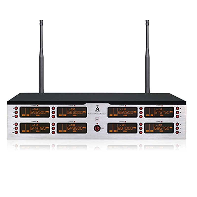 (1) 采用PLL数字锁相环多通道频率合成技术,标准IEEE Drat2.0 802.11n无线指标,确认传输的保密性和速度,严格的数字化保护,确认会议的私密性,避免和恶意干扰;采用性能稳定音频处理芯片,较高频动态压缩分流技术,将高低频自动分流加载,展现较好的动态性能;在50MHZ 频率带宽以250KHz间隔,提供多达200个信道选择,可扩展400个信通,可锁定控制功能选择,可调整无线增益连接功能;频率稳定度:士0.005%以内,动态范围: 100dB,频偏: ±45KHz,音频响应: 80Hz-18KHz,综合信躁比: >105dB,综合失真:≤0.5%,无线接口: BNe/50欧,灵敏度:12DB Bμ (80dBS/N),灵敏度调节范围:12-32DB,杂散阻止:≥75dB,输出电平:±10DB V,方便多套机器同时使用,轻松避开各类干扰;超远距离≥100米稳定讯号,采用一键自动雷达搜索频率自动对频,透彻简化复杂的工程安装,全新概念的数字导频技术,透彻解决KTV包房相互串频现象,串频;八个显示屏独立显示单路的信息,宽大清晰的高清2英尺液晶显示屏可查看无线单元的电池电量、频率信号、信号强弱、音频电平等信息状态;全硅胶导光按键,显示简结工整;声音曲线经过细致调教,声音温暖通透,配置有啸叫阻止功能电路,全新的音频电路构架,音频信号处理采用口碑性能稳定音频处理芯片,失真声音处理电路设计,在声音的细节上具有优良的表现力,有力的动态跟踪能力使得远和近距离拾音收放自如;调试简单,支持无线全数字通讯会议。