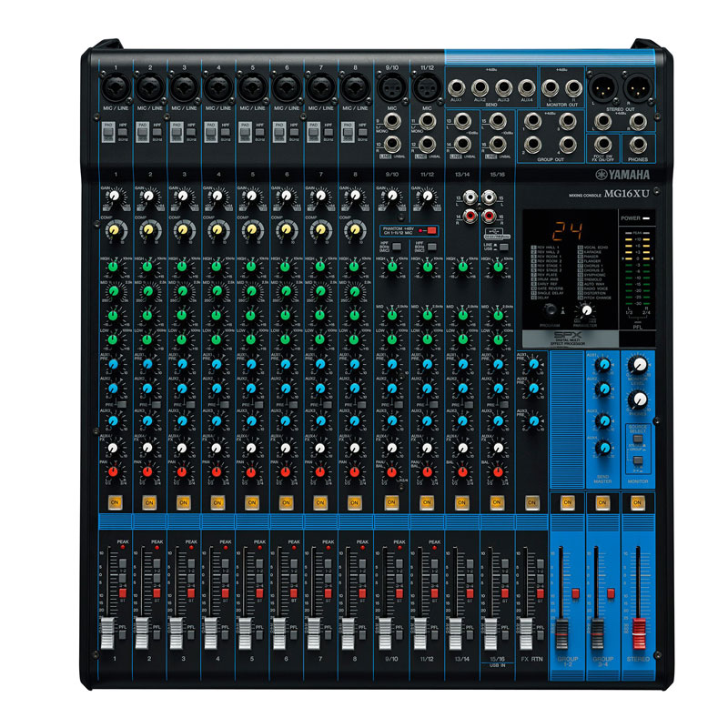 16通道调音台:多10个话筒 / 16 个线路输入 (8 个单声道 + 4 个立体声) / 4 编组母线 + 1 立体声母线 / 4 AUX (包括 FX)