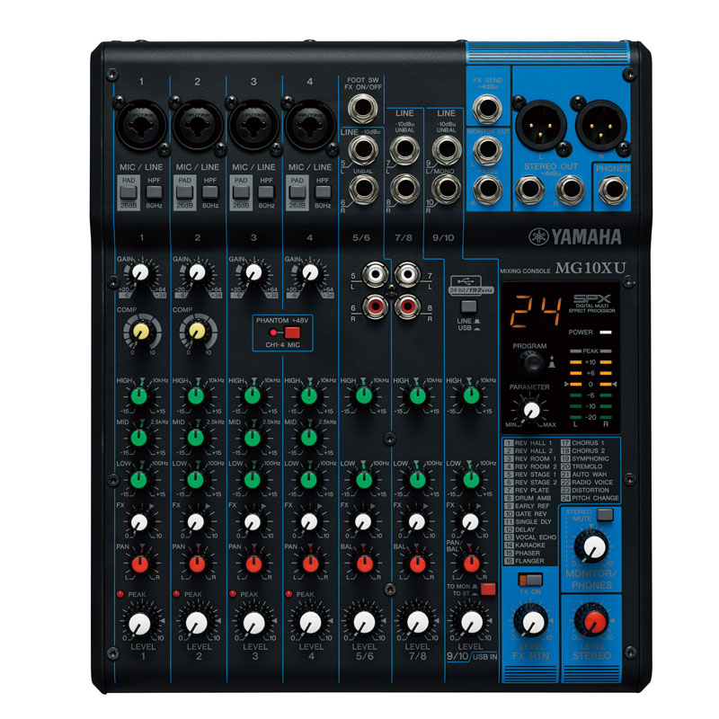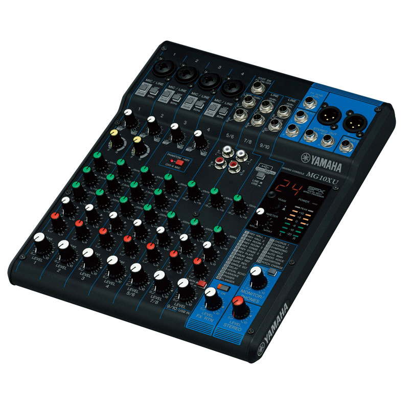 10通道调音台:4个话筒 / 10 个线路输入 (4 个单声道 + 3 个立体声) / 1 立体声母线 / 1 AUX (包括 FX)