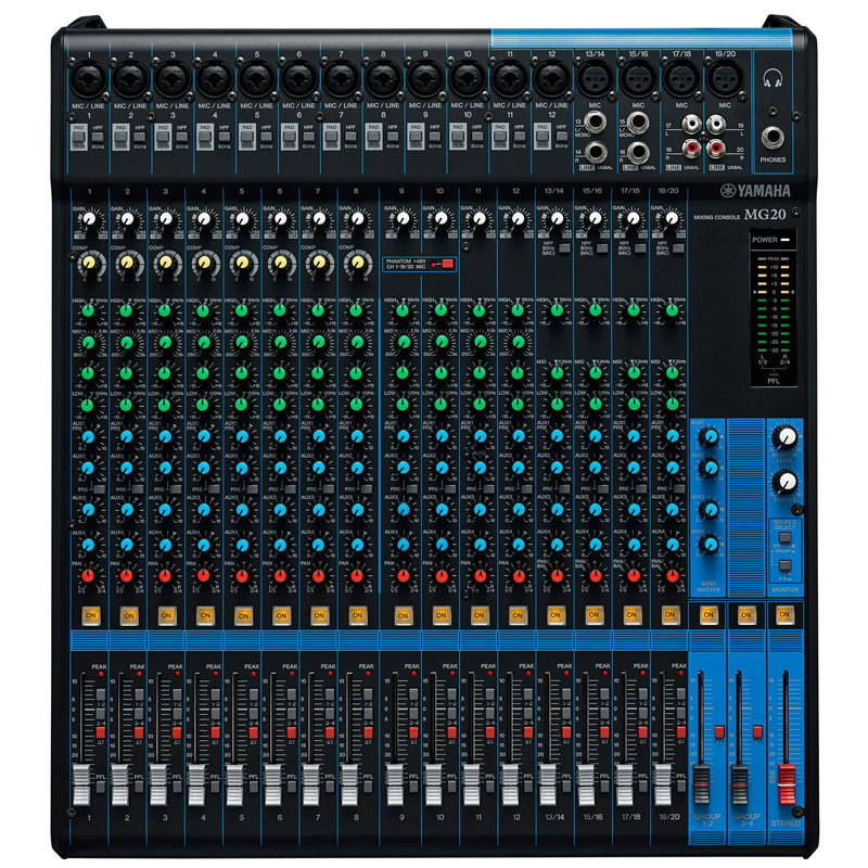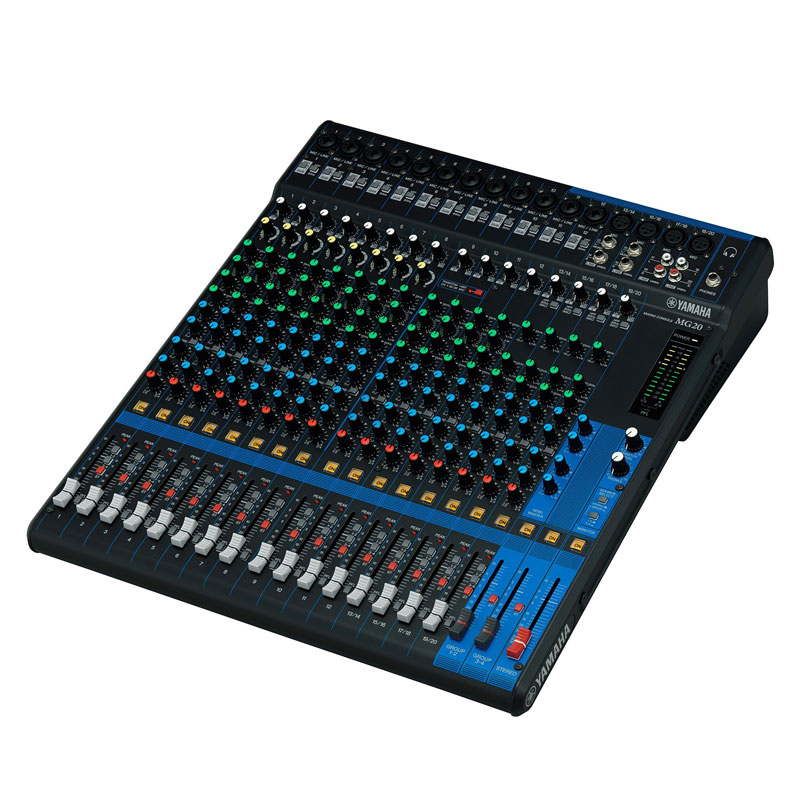 20通道调音台:16个话筒 / 20 个线路输入 (12 个单声道 + 4 个立体声) / 4 编组母线 + 1 立体声母线 / 4 AUX (包括 FX)