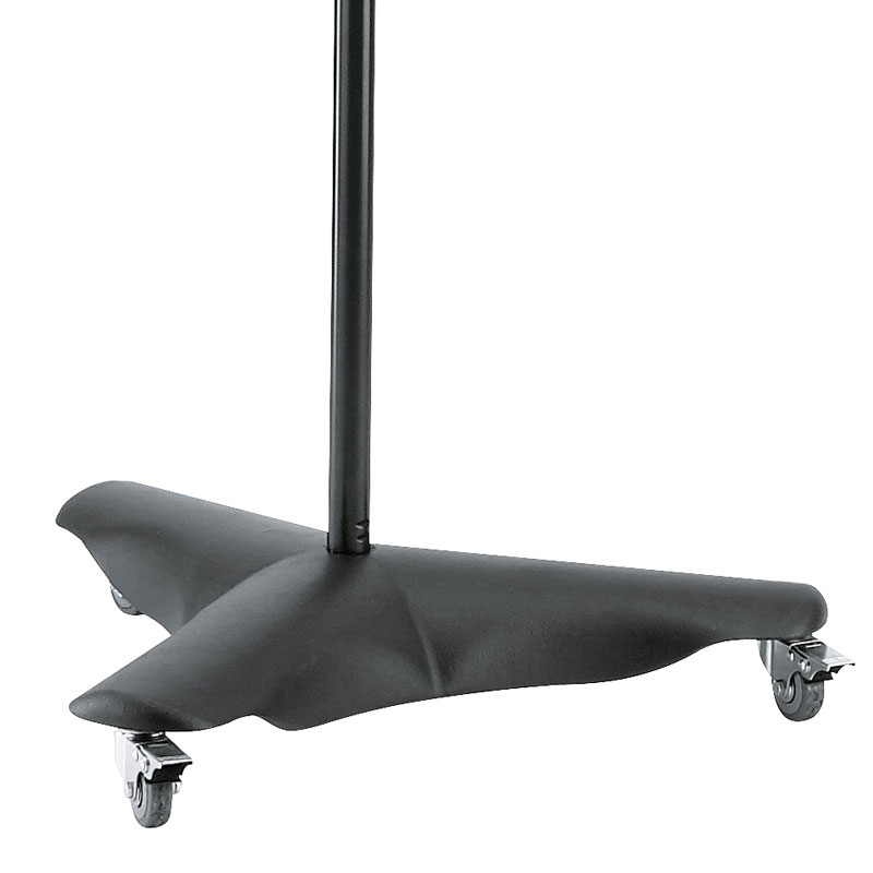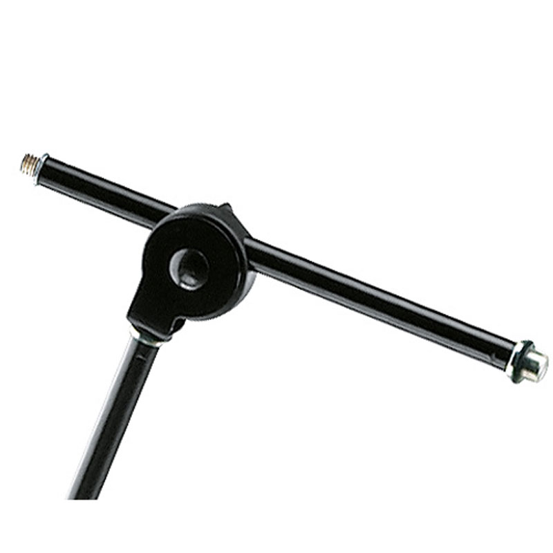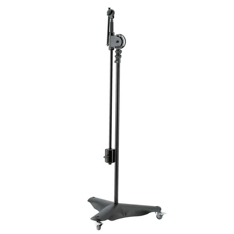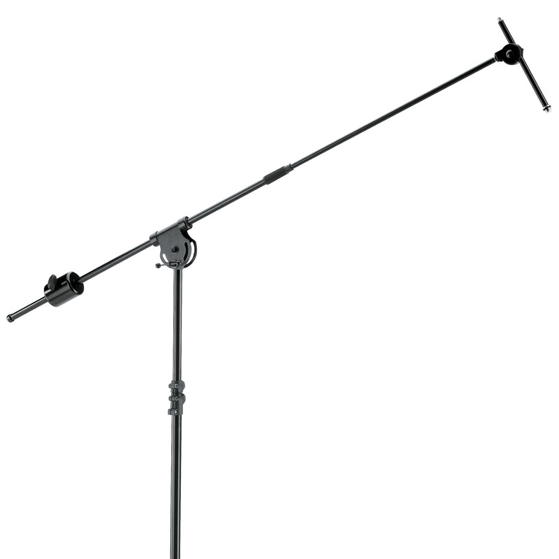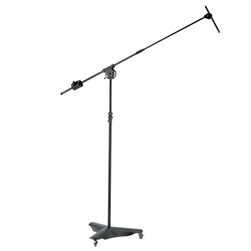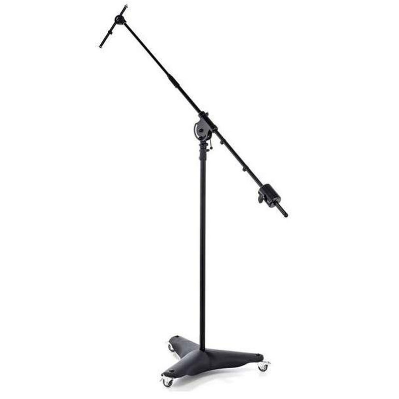 适用于演播室或舞台的移动重型钢制麦克风支架。10 公斤铸造金属底座,重心低,安然性高,配有 3 个可锁定脚轮。杆组合可延伸至 2 米以上,配有附加锁定机制。可伸缩吊杆臂配有 3 公斤配重和 5/8 英寸连接螺纹。附加迷你吊杆臂配有 5/8 英寸和 3/8 英寸连接螺纹,无论主吊杆臂的位置如何,均可全部调节,例如用于演播室麦克风。