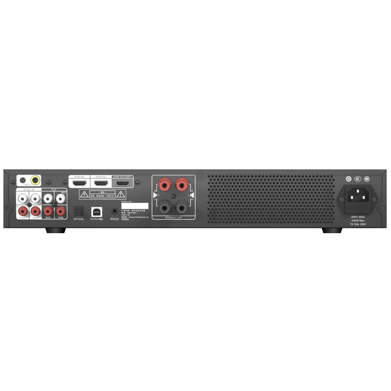 理器,用干对音乐或人声的音活提升、润色与美化。BEYOND系列没有三路6.35mm接口用千麦克风输入,分别位干前面桥和后面板,方使用户安装连接。产品还提供了丰富的音乐信号连接方式,包含两组RCA模拟输入接口,一路数字光屽接口,两路 HDMI数字信号输入和一路HDMI输出(ARC),加上蓝牙和USB播放功能,可满足用户灵活多样的应用需求。BEYOND系列共包含两个型号,区别于额定输出功事大小,便于用户搭配不同功率扬声器使用。