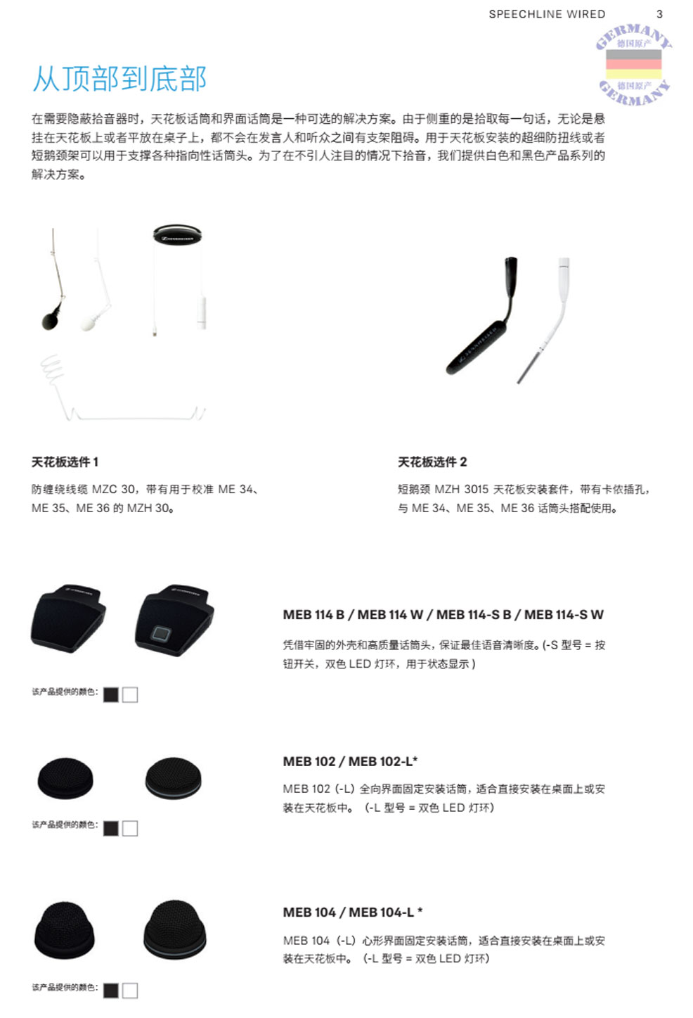 界面话筒支架,使用ME36话筒头。使用MZC 30 连接线连接。可轻松的安装于各种会议室,接待扩音录音。方便快速拆装,美观,可避免鹅颈话筒安装摆放的各种不便……