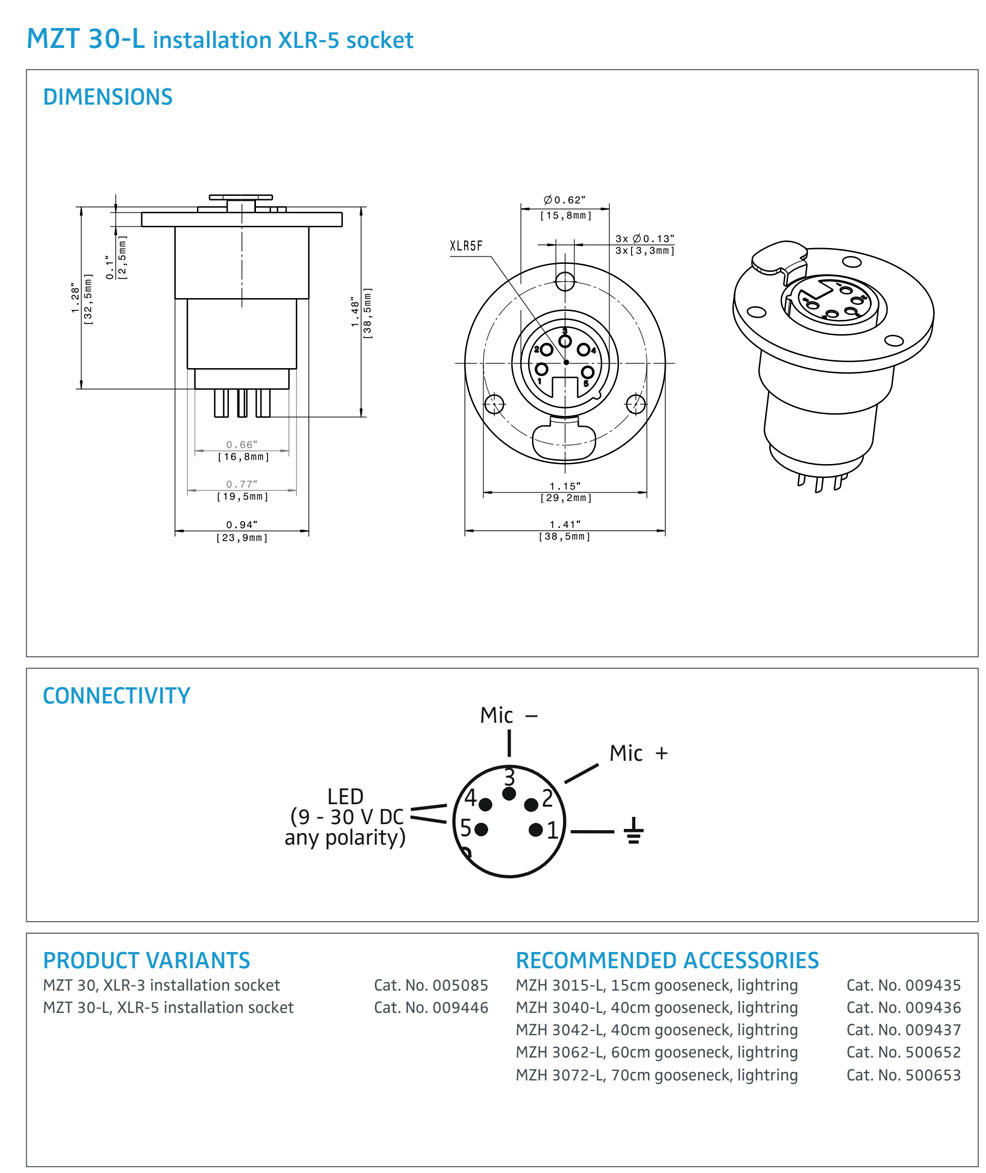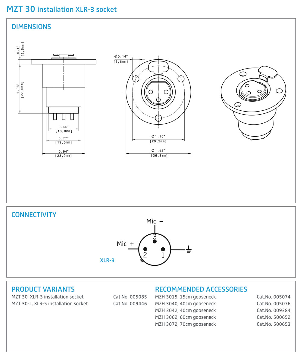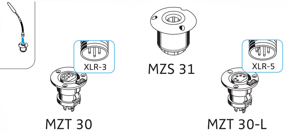 The MZT 30 is a flush mount with XLR-3 socket which can be used in combination with the Sennheiser MZH goosenecks.