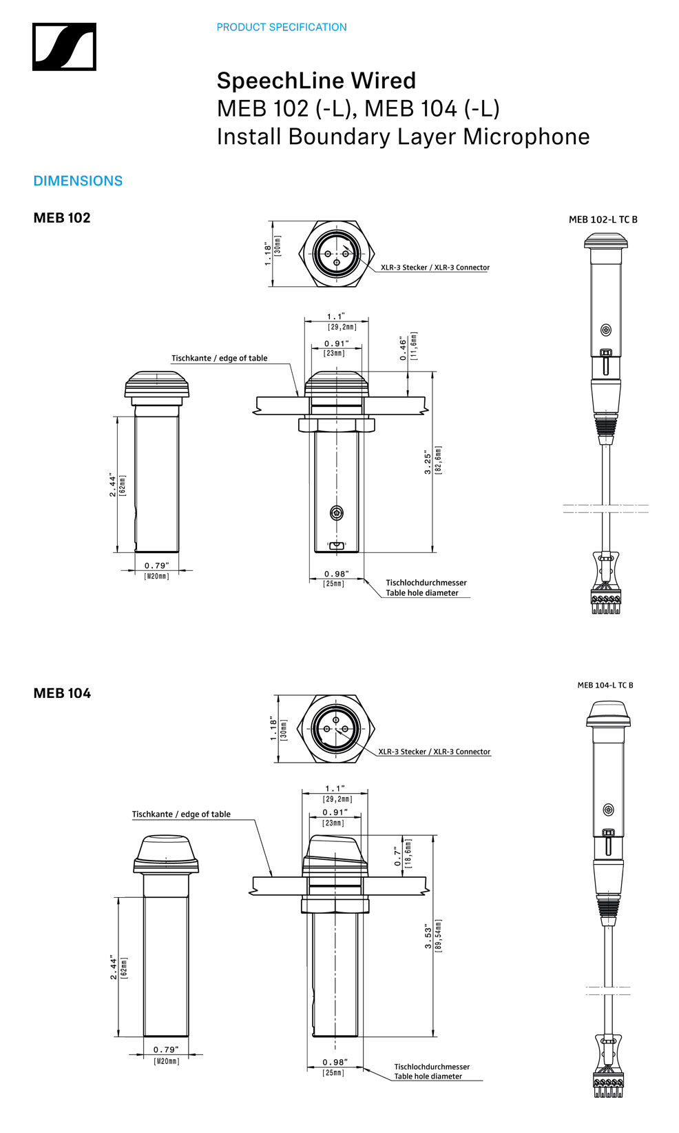 MEB 102(全指向性)和 MEB 104(心形指向性)是小巧而又设计低调的界面式话筒,能够适应任何室内装修风格,并且能够很容易地安装在诸 如桌面或是天花板等界面之上。每一款产品都采用了品质保证的森海塞尔话 筒极头,用以实现最佳的语音清晰度和可懂度。同时每一款产品也都采用了 坚固耐用的外壳进行保护。其中-L版本的产品还配有一个双色LED环形灯进 行状态指示。