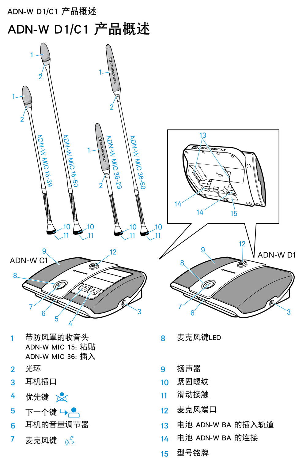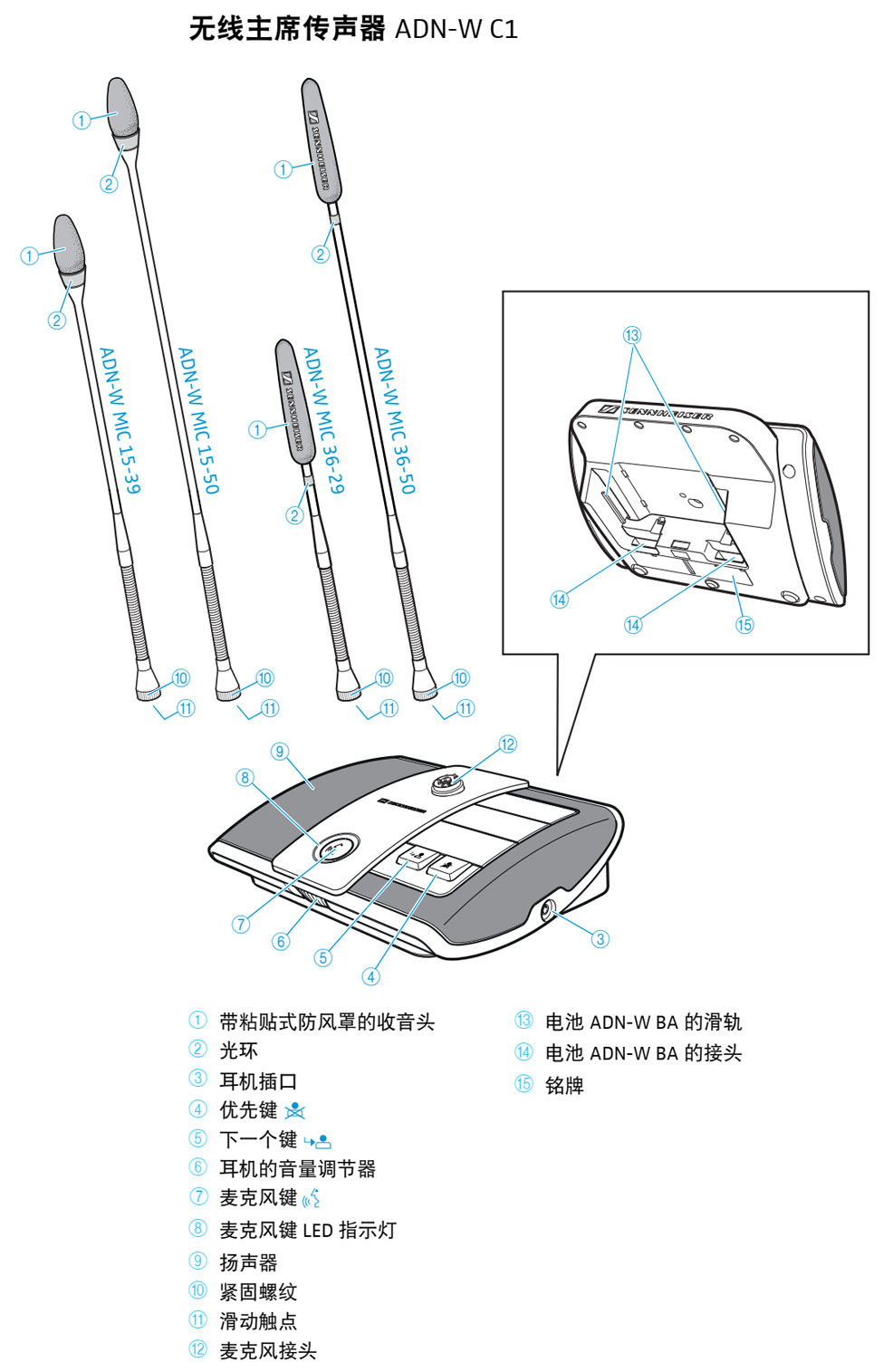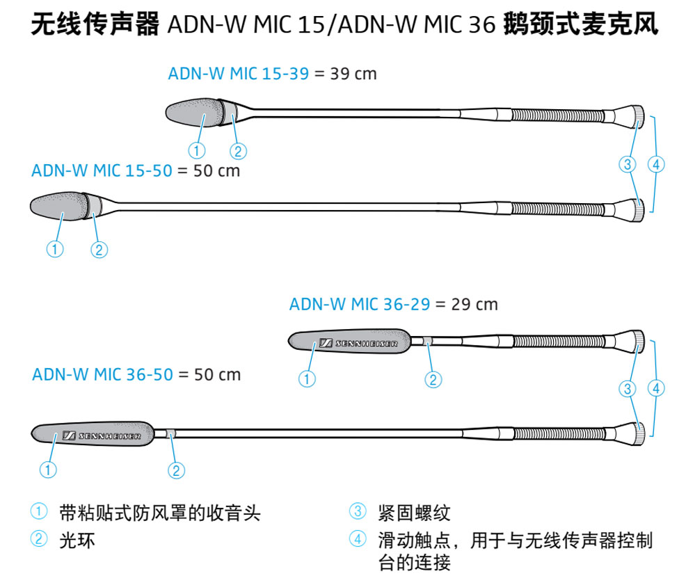 鹅颈式麦克风ADN-W MIC 15-39/15-50 和 ADN-W MIC 36-29/36-50是 森海塞尔 ADN 会议系统的组成部分。