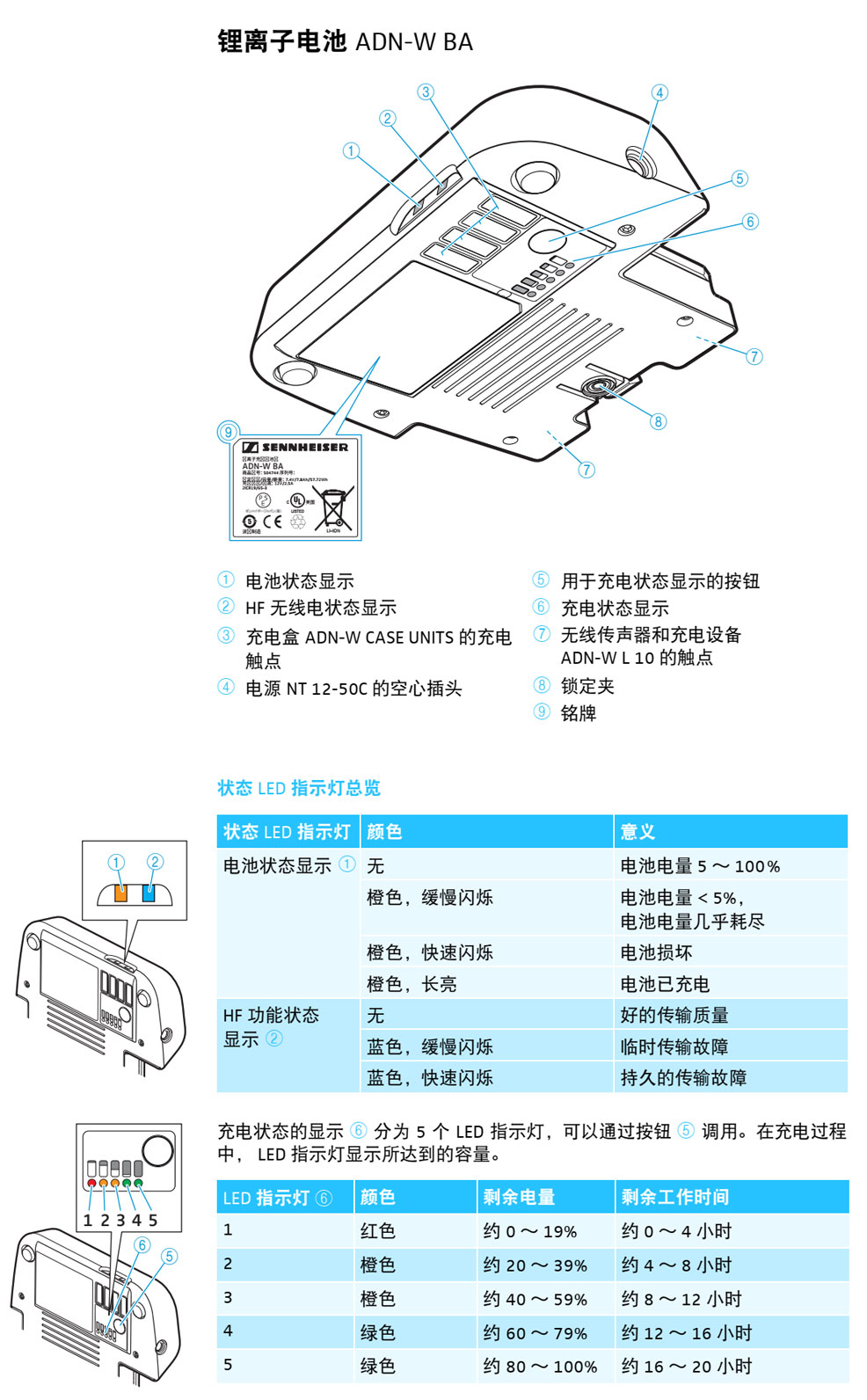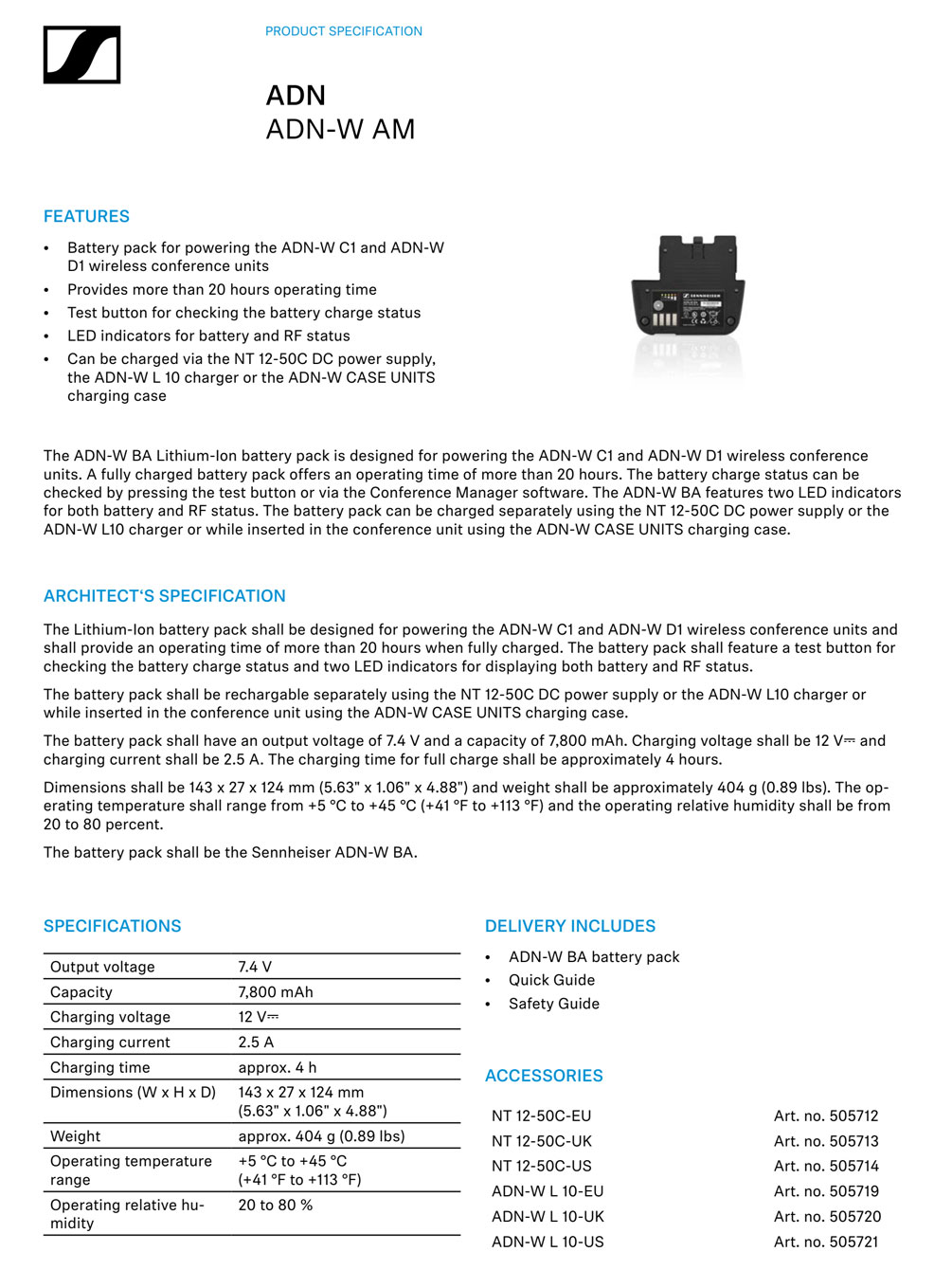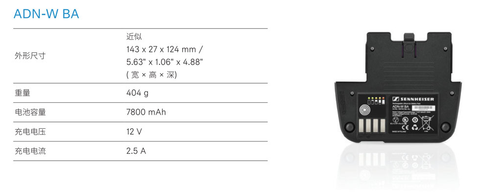 ADN-W BA锂离子电池组设计用于为ADN-W C1和ADN-W D1无线会议单元供电。一个充满电的电池组可以提供超过20小时的工作时间。