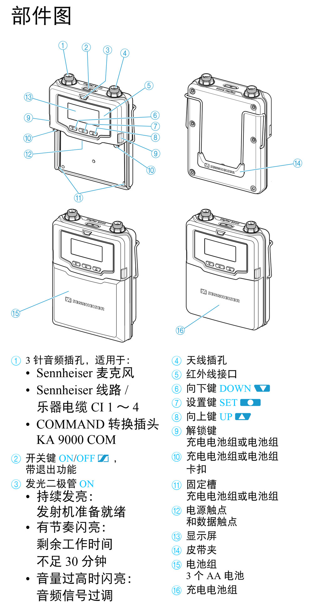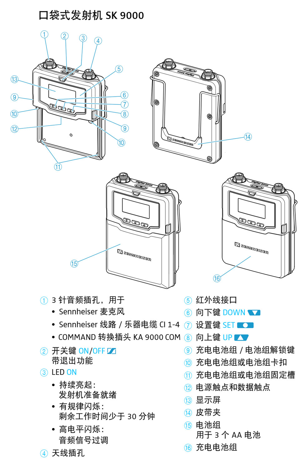 SK 9000轻便的数字腰包式发射器。适用于各种音频源:舞台、演播室或室外。即使在最严峻的条件下也能获得可靠的声音质量。容易隐藏在服装下。