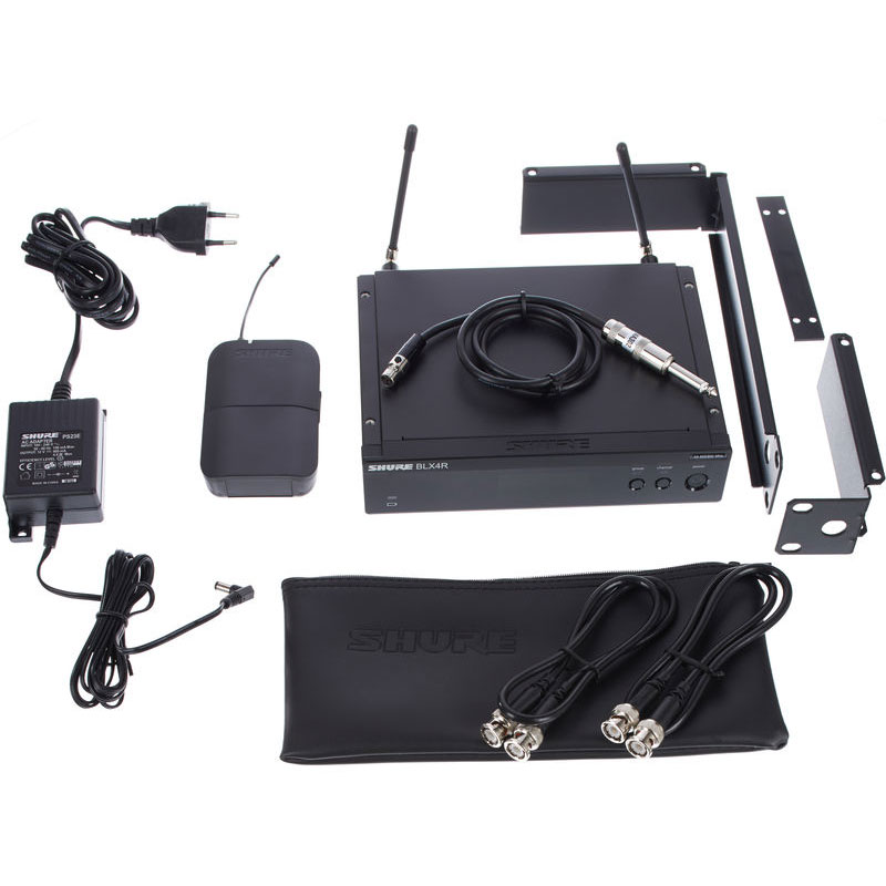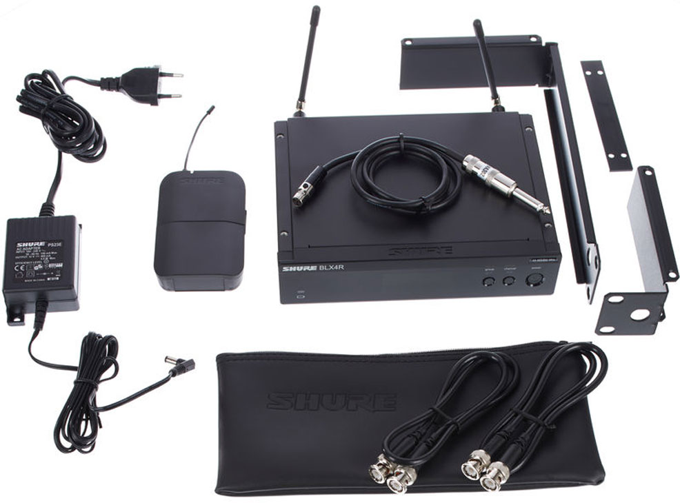 包含:BLX4R单通道无线接收机;BLX1腰包式发射机;WA302吉他线缆;PS23电源和URT2机架托盘(可选配件)。