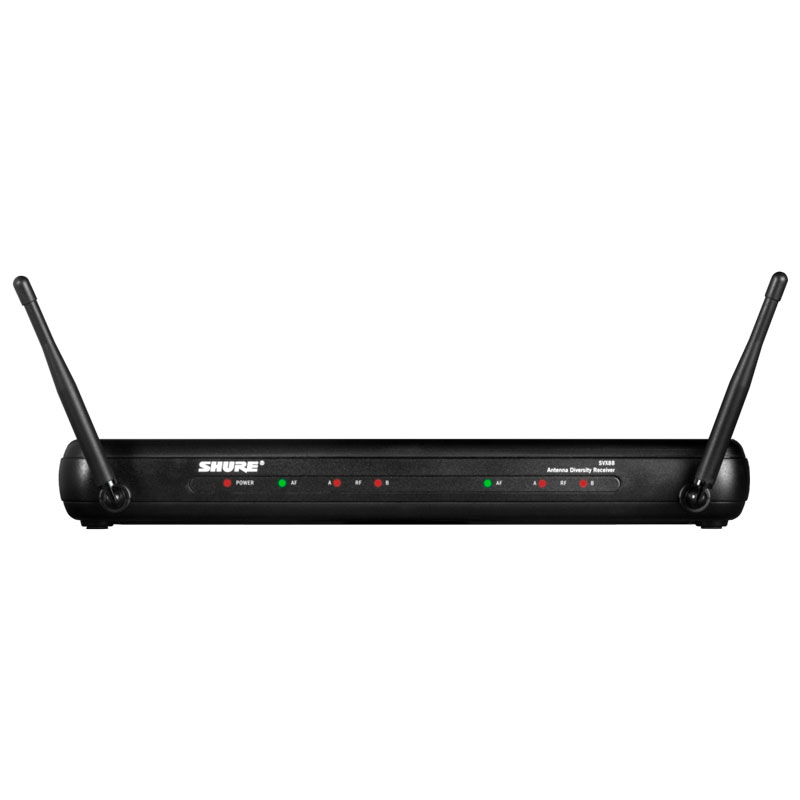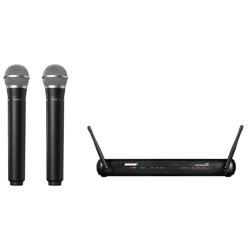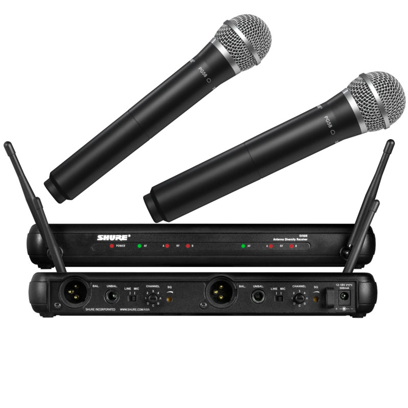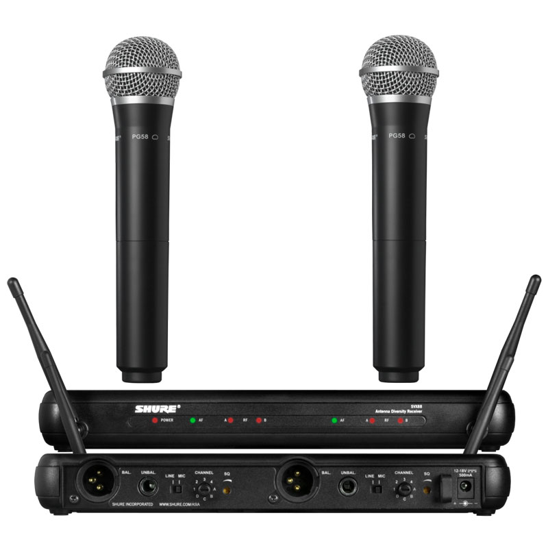 包括SVX88双通道分集接收机,2个带PG58话筒头的手持发射机。