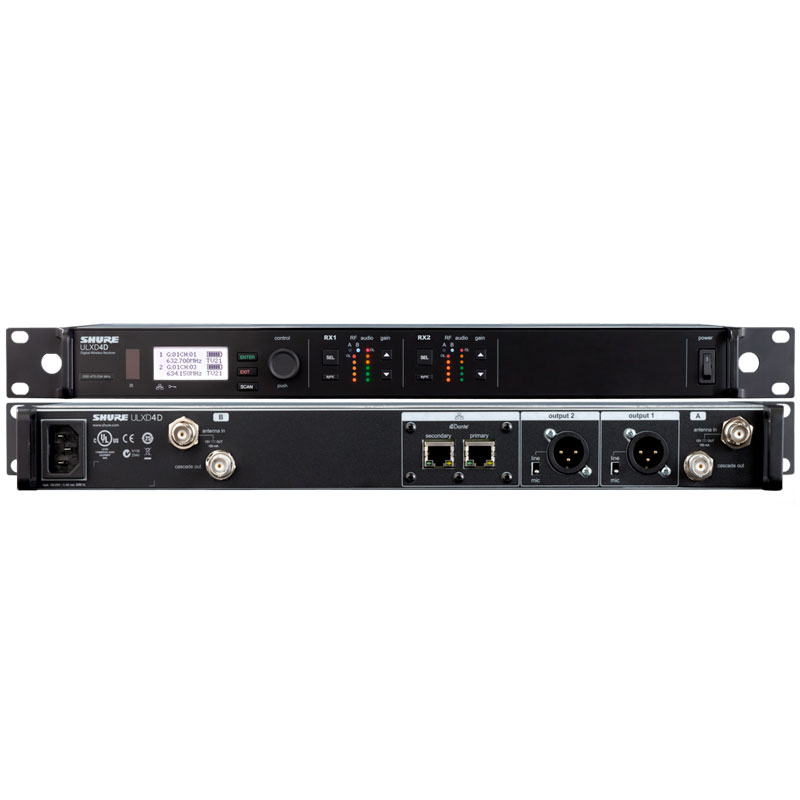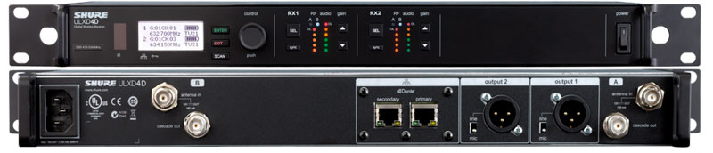 舒尔ULXD4D双通道数字无线接收机采用双通道,集无与伦比音质、射频信号稳定性和先进的设置功能于一体,1U机架式结构设计,全金属外壳轻巧紧凑且坚固耐用,品质非凡。两个独立接收机分别配备独立的音频和射频电平表、增益控制及接收机输出接口,可根据需要直接输出或合并输出,实现灵活的信号通路。同时,该设备拥有射频级联端口和两个以太网端口,可轻松进行联网和共享射频信号,简化频率协调与部署。对于联网的音频应用环境,DANTE? 数字音频传输网络功能可通过一条以太网线缆实现多路音频信号收发。若需要使用更多兼容通道进行近距离传输音频信号时,便可启用高密度模式大幅提高可用开放频率的数量。此外,ULXD4D还囊括了ULX-D数字无线系统的所有功能和优势,是业界领先划时代的产品,将专业级扩声应用性能提升至一个新水平。