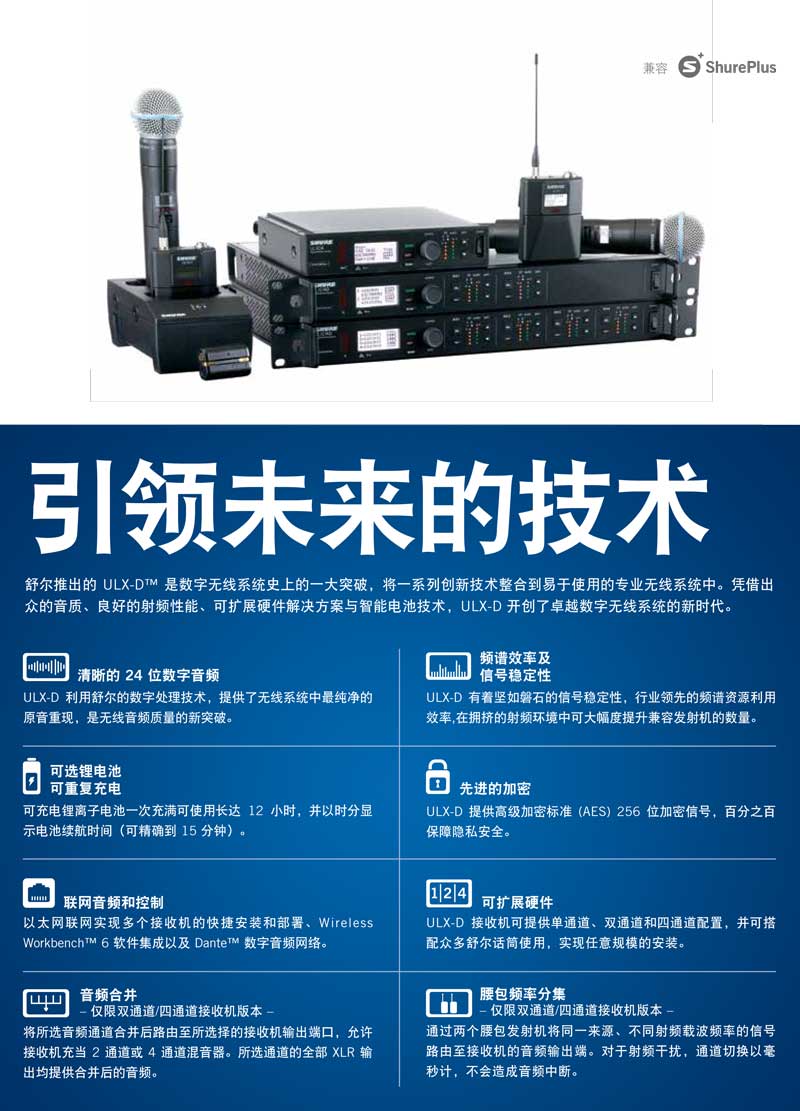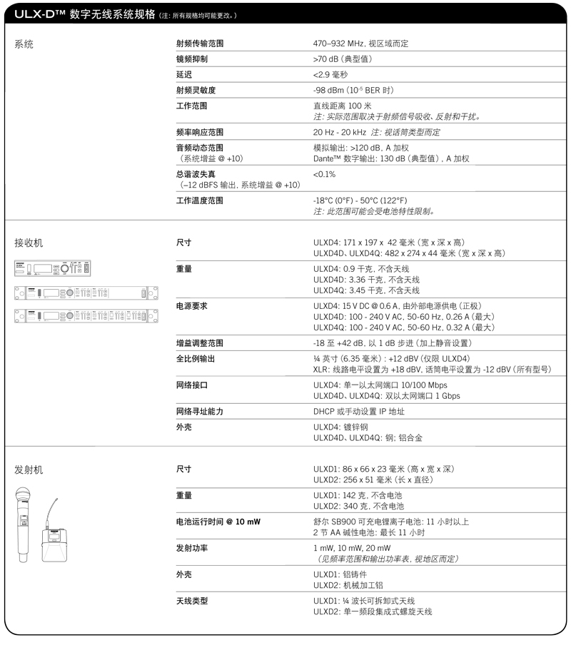ULXD1为无线腰包式发射机,与ULX-D?无线数字系统兼容。