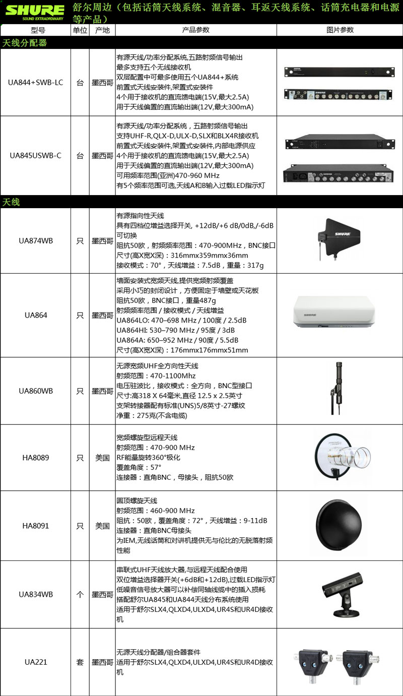 Shure UA844+SWB-LC 舒尔天线放大器 分配器