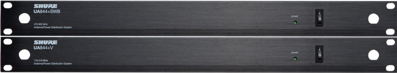 舒尔UA844+/LC天线分配系统可将一对天线分频至多台接收机,达到扩展无线话筒系统的目的。UA844+/LC还可放大射频信号,补偿因信号功率被分至多个输出而造成的插入损耗。单个UA844+/LC系统可最多支持五个无线接收机。双层配置中可最多使用五个UA844+/LC系统。