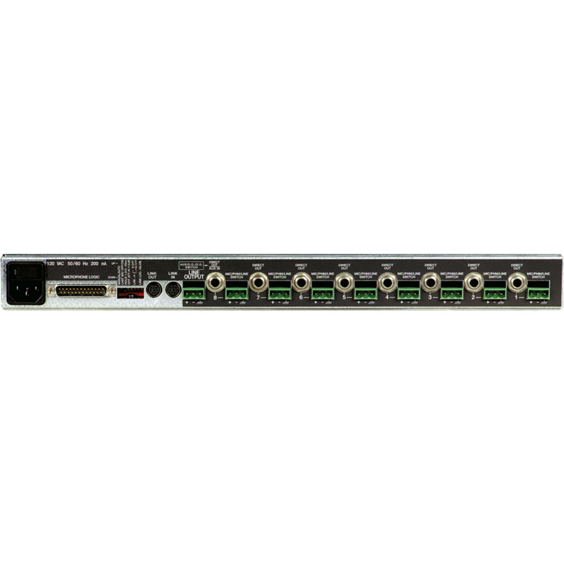 每个通道可调整的EQ,48 V幻象电源,活动均衡话筒(或线路)电平输入,线路电平输出,抗射频干扰的高性能底板和电路,对话筒激活的完全逻辑控制,最多可连接400个话筒的功能,且具有内部电源。120/230 Vac电源。