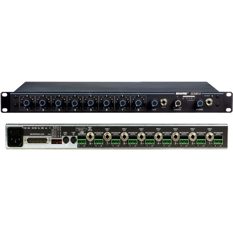 可与任何低阻抗动圈或电容话筒(包括无线话筒)配合使用。 多台SCM810混音器能与其他SCM810混音器、以及舒尔SCM410和SCM800连接。