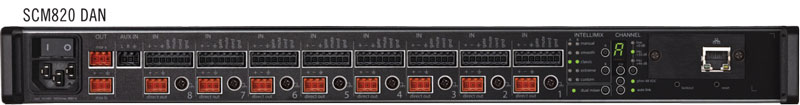 连接配备Dante的SCM820,最多可利用12台设备组成大型自动混音器(96个音频通道), 兼容控制系统(AMX、Crestron)。