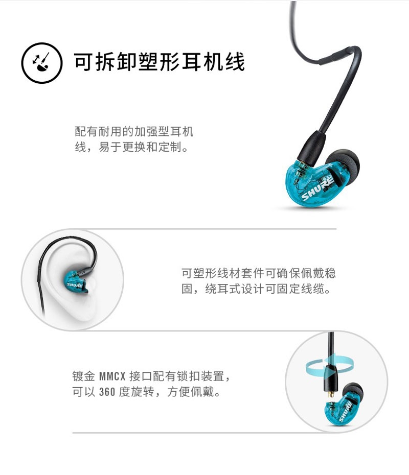 隔音设计,可隔离超过90%的环境噪音。微型动圈发声单元能带来细腻饱满的声音和强劲低音。配备可塑形线材套件的可拆卸式线缆与佩戴舒适安全的各种配件;