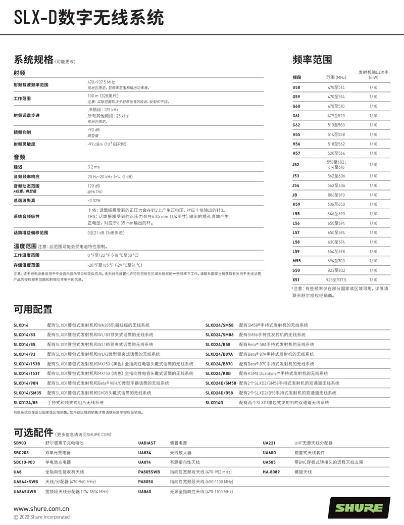 SLXD2/B87A配备Beta?87A可互换的话筒头。从报告厅到现场演出,SLXD2/B87A是让您对演讲和人声表演充满信心的理想之选。