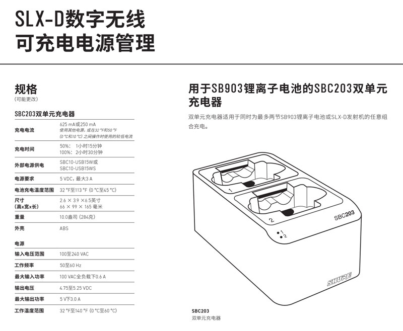 2节AA电池可持续使用长达8小时,也可选配舒尔SB903可充电电池