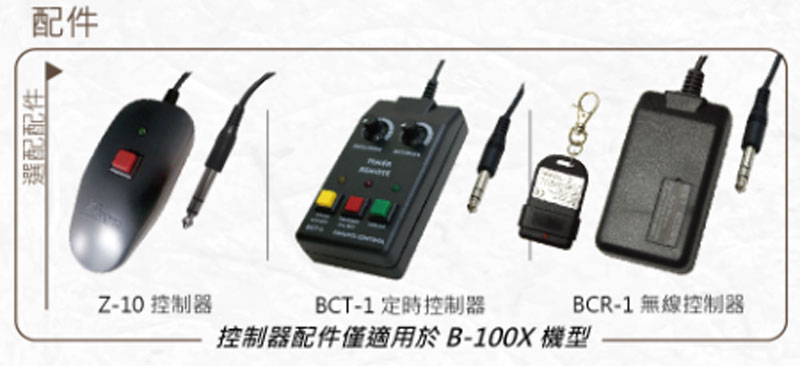 【附注】:B-100X机型含有一个控制板可以接受定时器和无线摇控器的控制。而B-100 机型则不含此控制板,其余部分此两型机器功能完全相同。