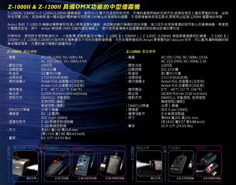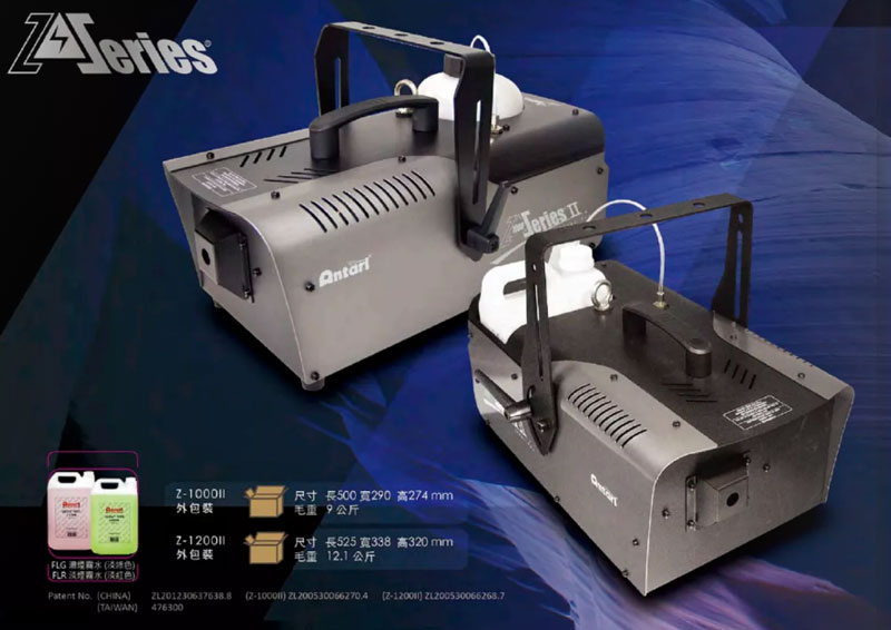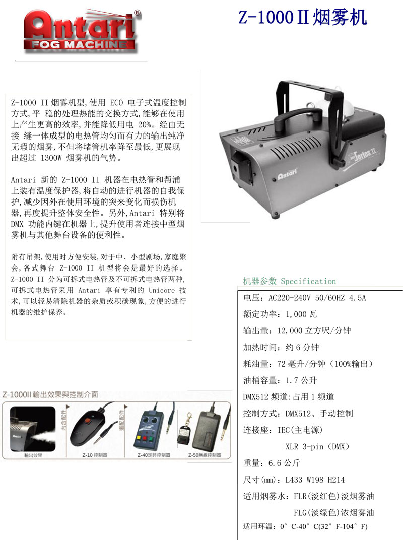 附有吊架,使用时方便安装,对于中、小型剧场,家庭聚会,各式舞台 Z-1000 II 机型将会是最好的选择。 Z-1000 II 分为可拆式电热管及不可拆式电热管两种,可拆式电热管采用 Antari 享有专利的 Unicore 技术,可以轻易清除机器的杂质或积碳现象,方便的进行机器的维护保养。