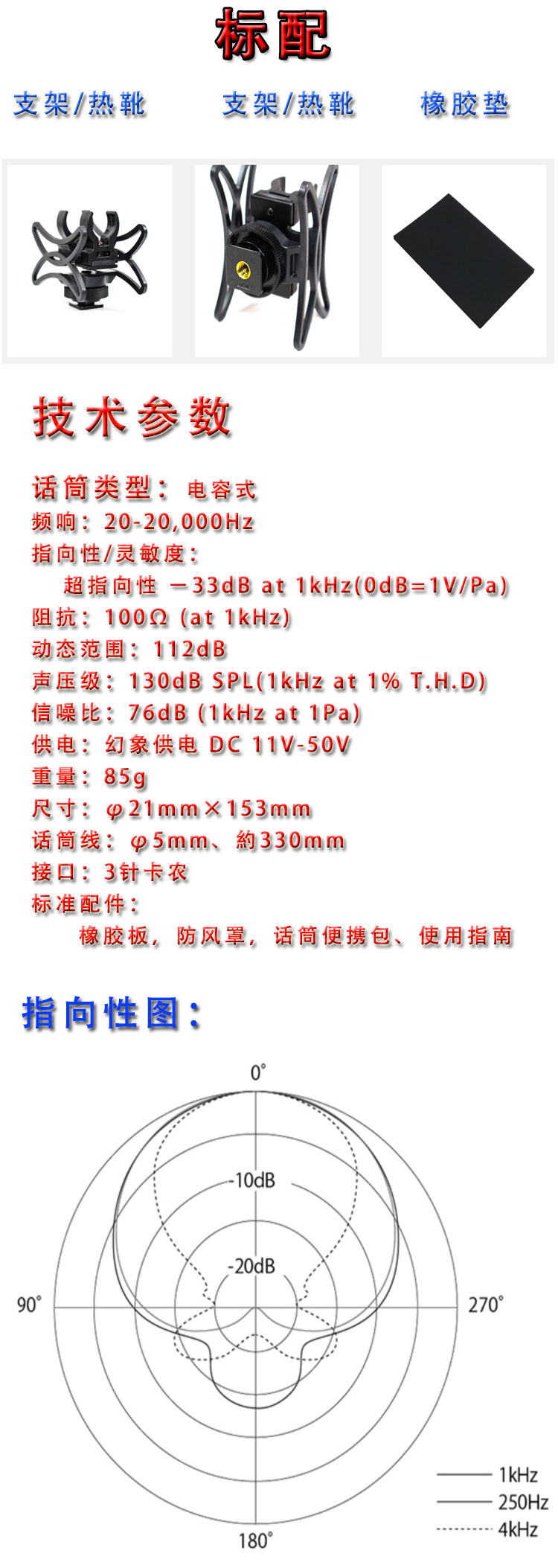 指向性/灵敏度超指向性/灵敏度:-33 dB at 1kHz (0dB = 1V/Pa)