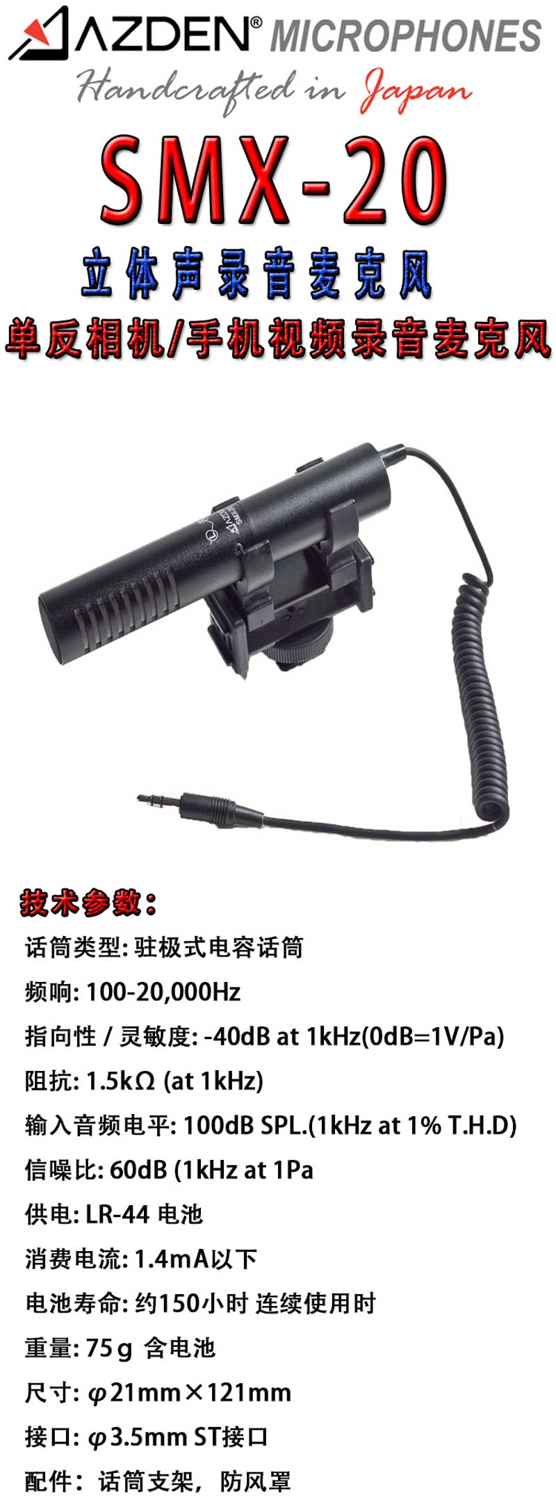 产品名称: AZDEN SMX-20 品牌: AZDEN 型号: SMX-20 有无线: 有线 产地: 日本 声道: 2 颜色分类: 黑色 使用方式: 悬挂式 供电方式: 可换电池麦克风 类型: 电容式 适用对象: 手机 录音专用 采访专用